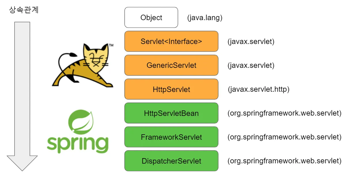 ์์ ๊ฐ์ ์์ ๊ด๊ณ๋ฅผ ๊ฐ๋๋ค. HttpServlet๊น์ง๋ย WAS๋ผ ๋ถ๋ฆฌ๋ ํฐ์บฃ์์ ๊ตฌํ๋๊ณ , ์คํ๋ง์ย WAS๋ก ๋ถํฐ ์์๋ฐ์ย HttpServlet์ ์ด์ฉํ์ฌ ์คํ๋ง์์ ์ฐ์ด๋ย Servlet๋ค์ ๊ตฌํํ๋ค.