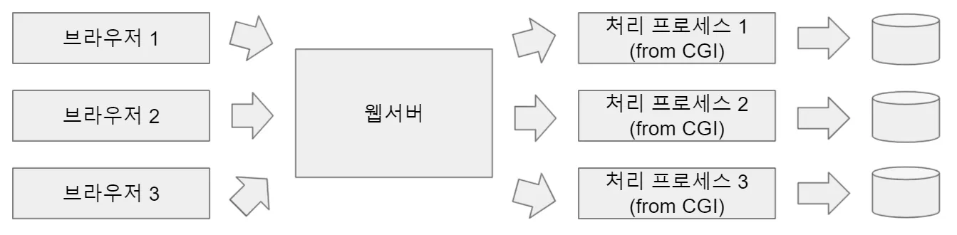 CGI๋ ๋ธ๋ผ์ฐ์ ์์ ์น์๋ฒ์ ์์ฒญ์ด ๊ฐ์ ๋, ๊ฐ๊ฐ์ ๋ํ ์ฒ๋ฆฌ ํ๋ก์ธ์ค๋ฅผ ๋ง๋ค์ด๋ธ๋ค๋ ๋จ์ ์ด ์์๋ค. ๊ทธ๋์ ๋๋์ ํธ๋ํฝ์ ์ฒ๋ฆฌํ๊ธฐ์๋ ์ฝ๊ฐ ๋ฌด๋ฆฌ๊ฐ ์์๋ค.