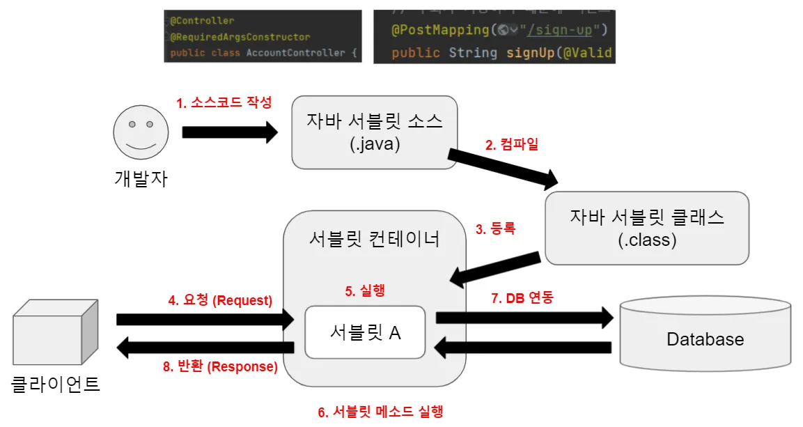 ๊ฐ๋ฐ์๊ฐ ์๋ฐ ์๋ธ๋ฆฟ ์์ค์ฝ๋(.java)๋ฅผ ์์ฑํ๋ค. (์์์๋ ์คํ๋ง ํ๋ ์์ํฌ๋ฅผ ์ด์ฉํด ์์ฑ)