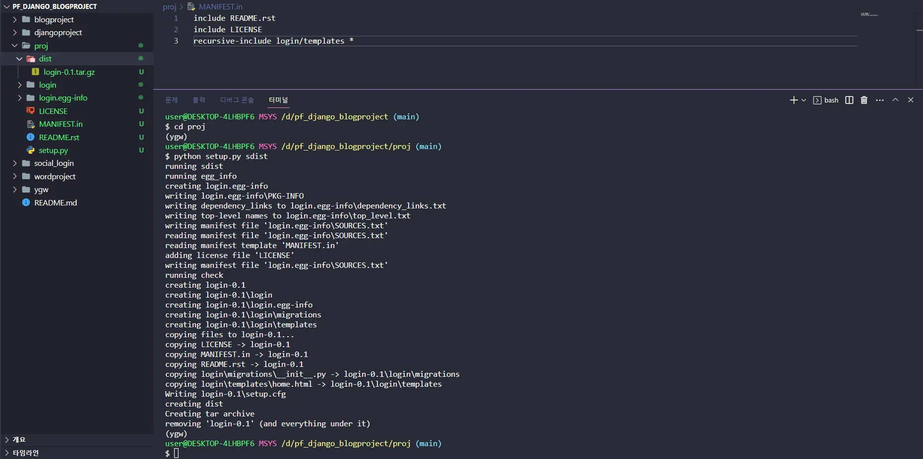 해당 명령어를 입력해주면 setup.py 파일이 있는 경로의 파일들이 login-0.1.tar.gz의 패키지 파일 하나로 묶이게 된다.