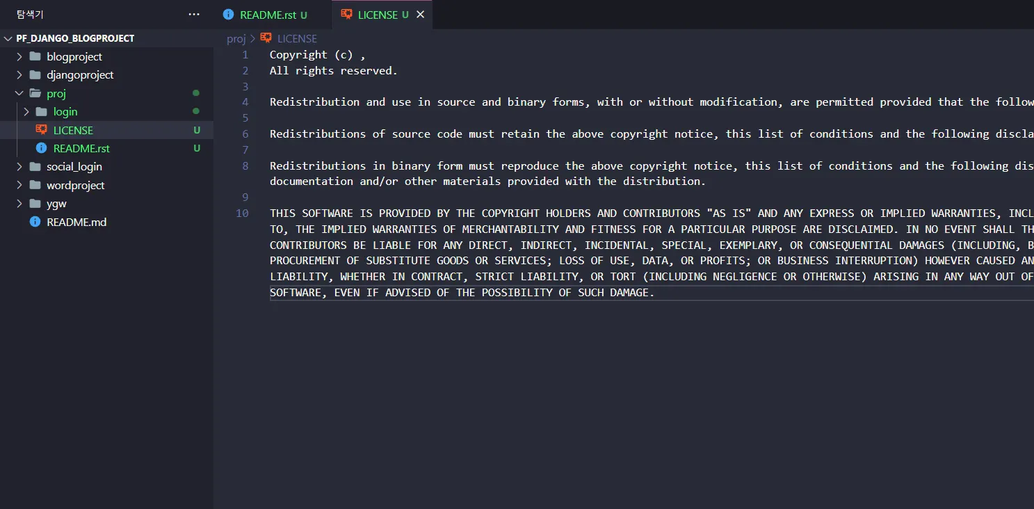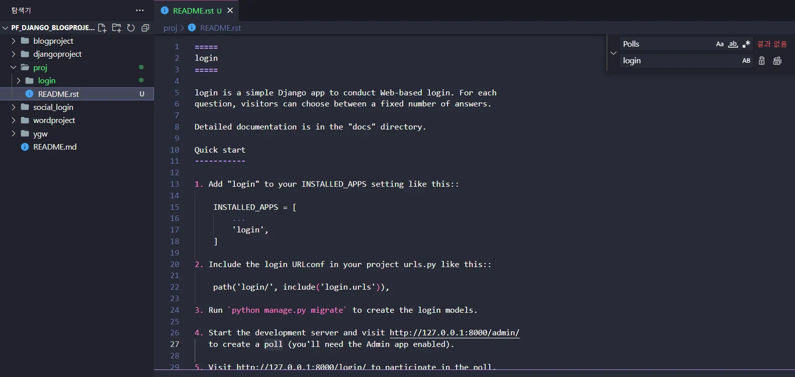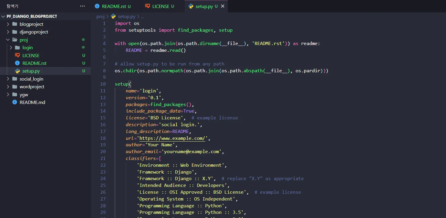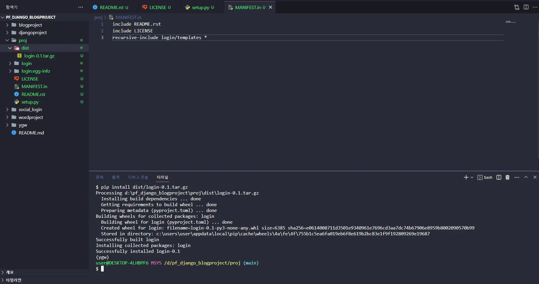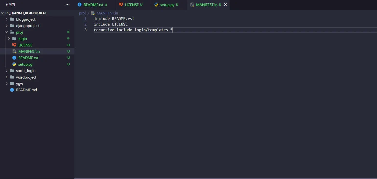 include README.rst 와 incldue LICENSE 로 방금 만든 파일(.py 제외)을 include 해준다. 그리고 login/templates 안에 담긴 모든 파일들을 include 하기 위해 recursive-inclue 구문으로 다중 import를 진행한다.