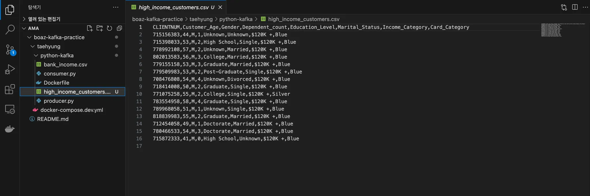 아래 실습은 Kafka를 사용하여 bank_income CSV 파일에서 고객 정보를 읽어와, 소득이 $120K 이상인 고객 정보를 필터링하고, 이를 새로운 CSV 파일에 저장하는 프로그램 실습입니다.