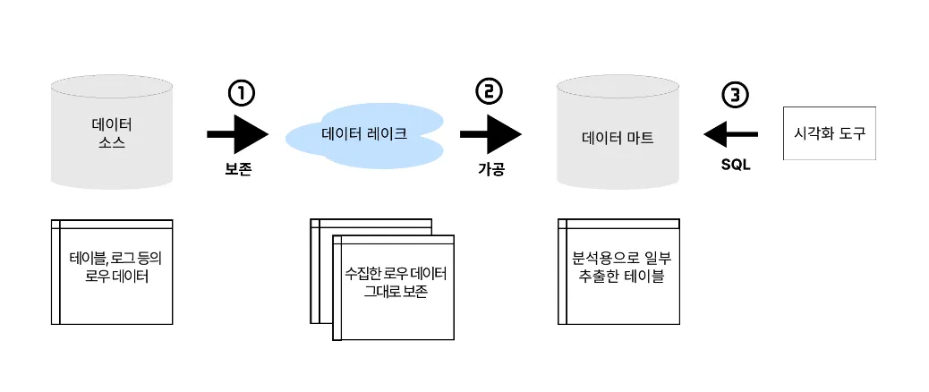 → 데이터 레이크 등을 이용하여 데이터를 있는 그대로 적재.
