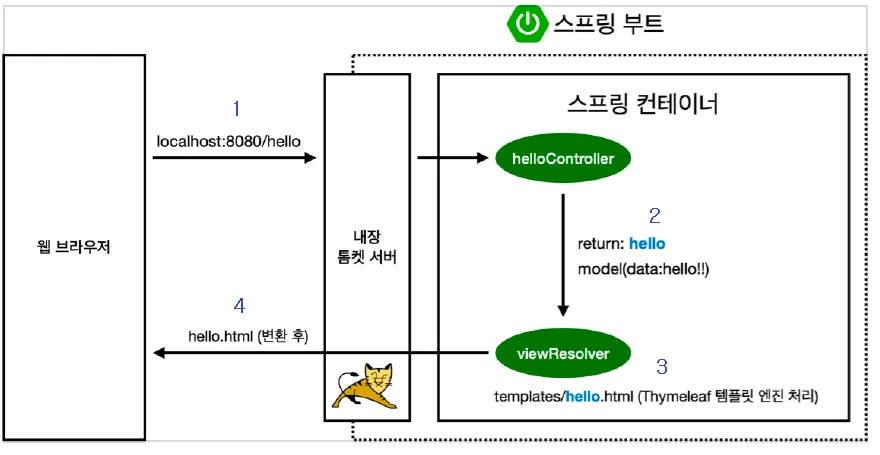 컨트롤러에서 리턴 값으로 문자를 반환하면 뷰 리졸버(ViewResolver) 가 화면을 찾아서 처리한다.
