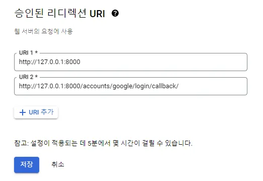 일단 여기까지 입력 후, Client id와 Secret key를 입력해야하는데, 해당 부분은 구글에서 직접 설정해야한다.
