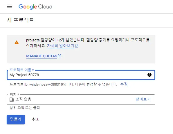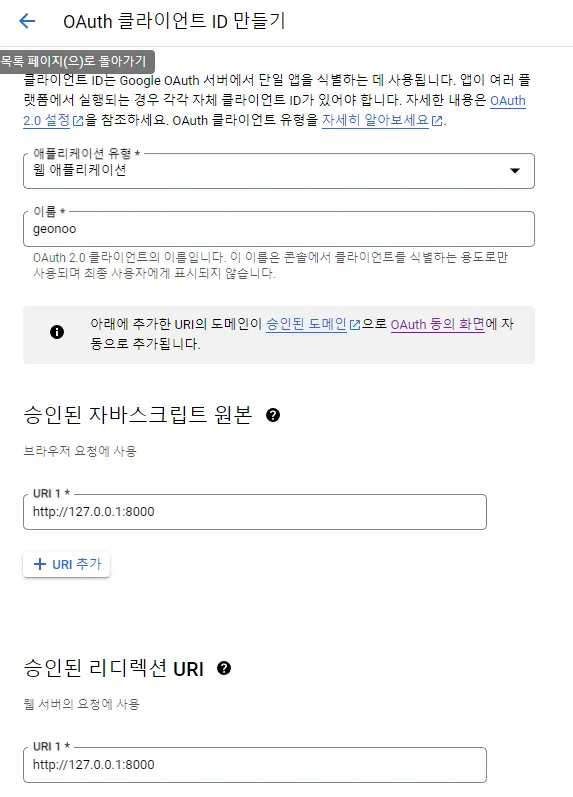 다시 사용자 인증 정보로 돌아와서 위와 똑같이 OAuth 클라이언트 ID 선택한다. 유형은 웹 애플리케이션을 선택하고, 다음과 같이 작성한다.