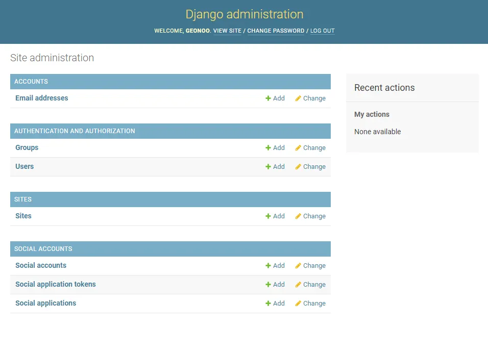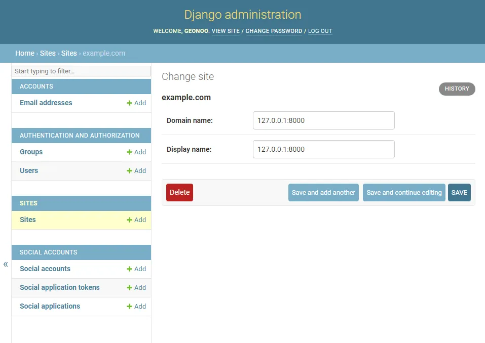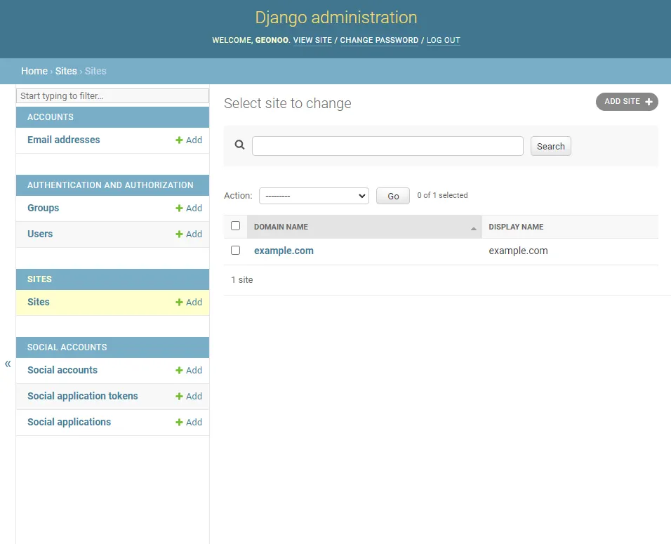 서버를 켜 admin 사이트에 접속하면, 하단에 SITES와 SOCIAL ACCOUNTS가 생겨있다.