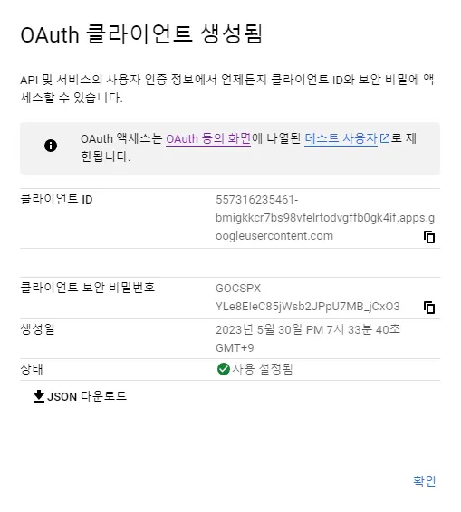 다음과 같이 클라이언트 ID와 시크릿 키가 생성된다. 복붙해준다.