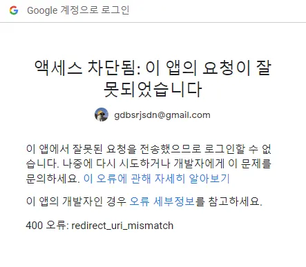 이렇게 400 에러가 뜬다. 이는 callback 주소가 등록되지 않아서 그런것이다. 아래와 같이 수정해주고