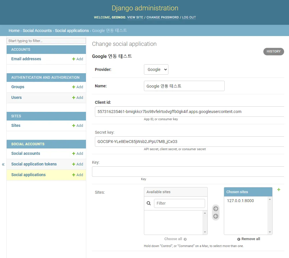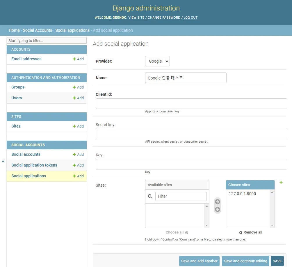 구글 계정과 소셜 로그인 기능을 연동 하려면 social applications에 계정을 추가해줘야 한다.