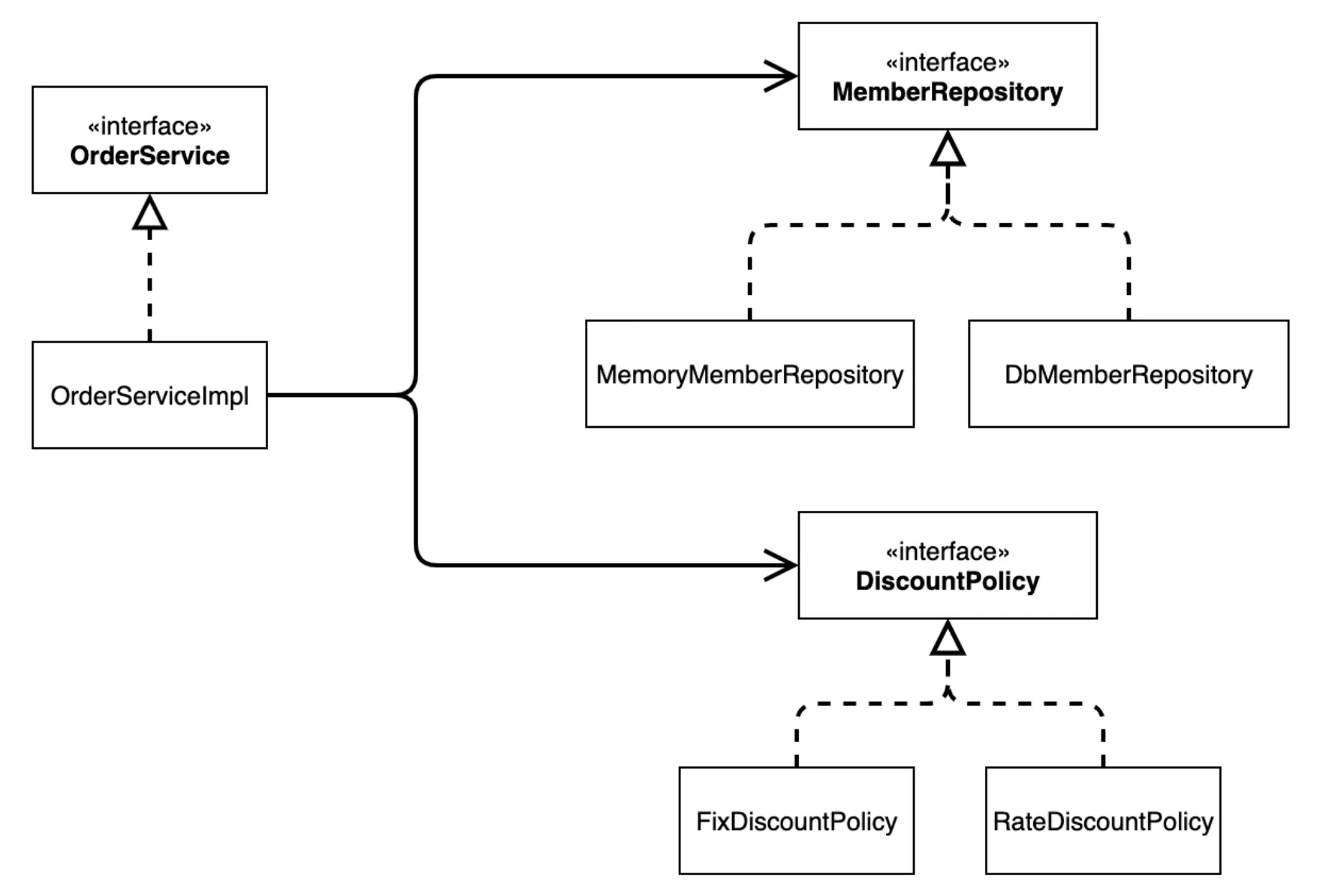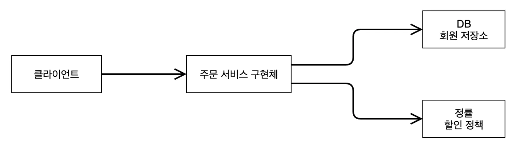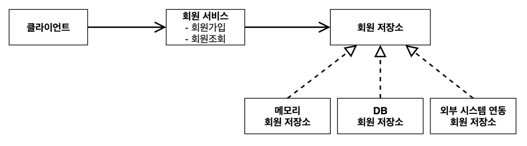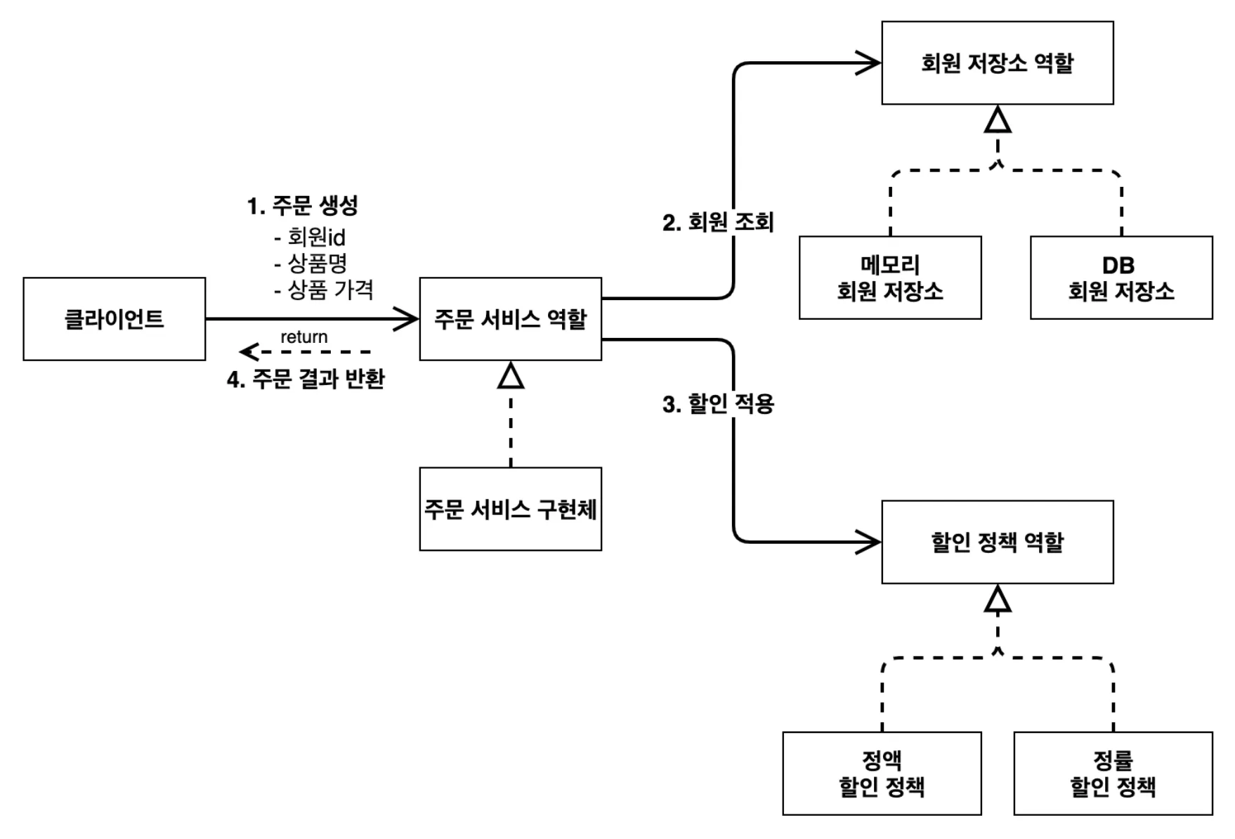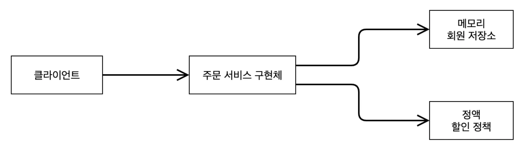 회원을 메모리가 아닌 실제 DB에서 조회하고, 정률 할인 정책(주문 금액에 따라 % 할인)을 지원해도 주문 서비스를 변경하지 않아도 된다.