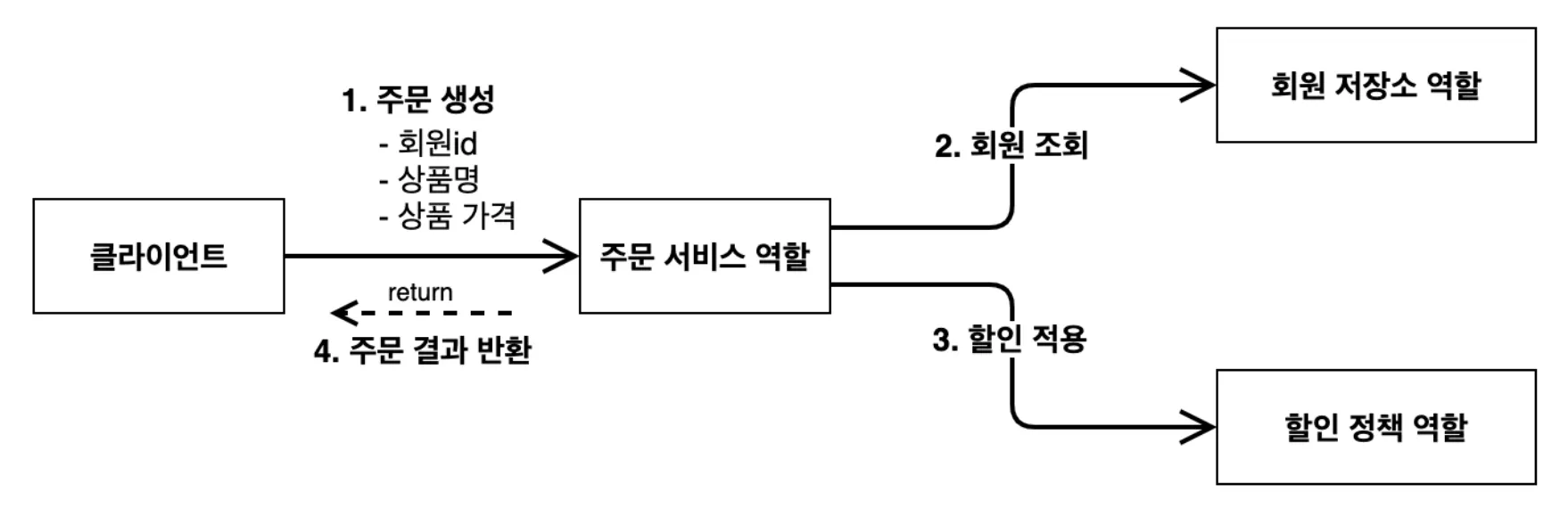 회원을 메모리에서 조회하고, 정액 할인 정책(고정 금액)을 지원해도 주문 서비스를 변경하지 않아도 된다. 역할들의 협력 관계를 그대로 재사용 할 수 있다.