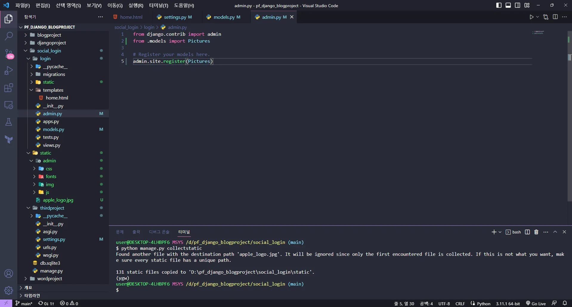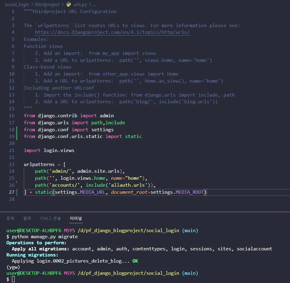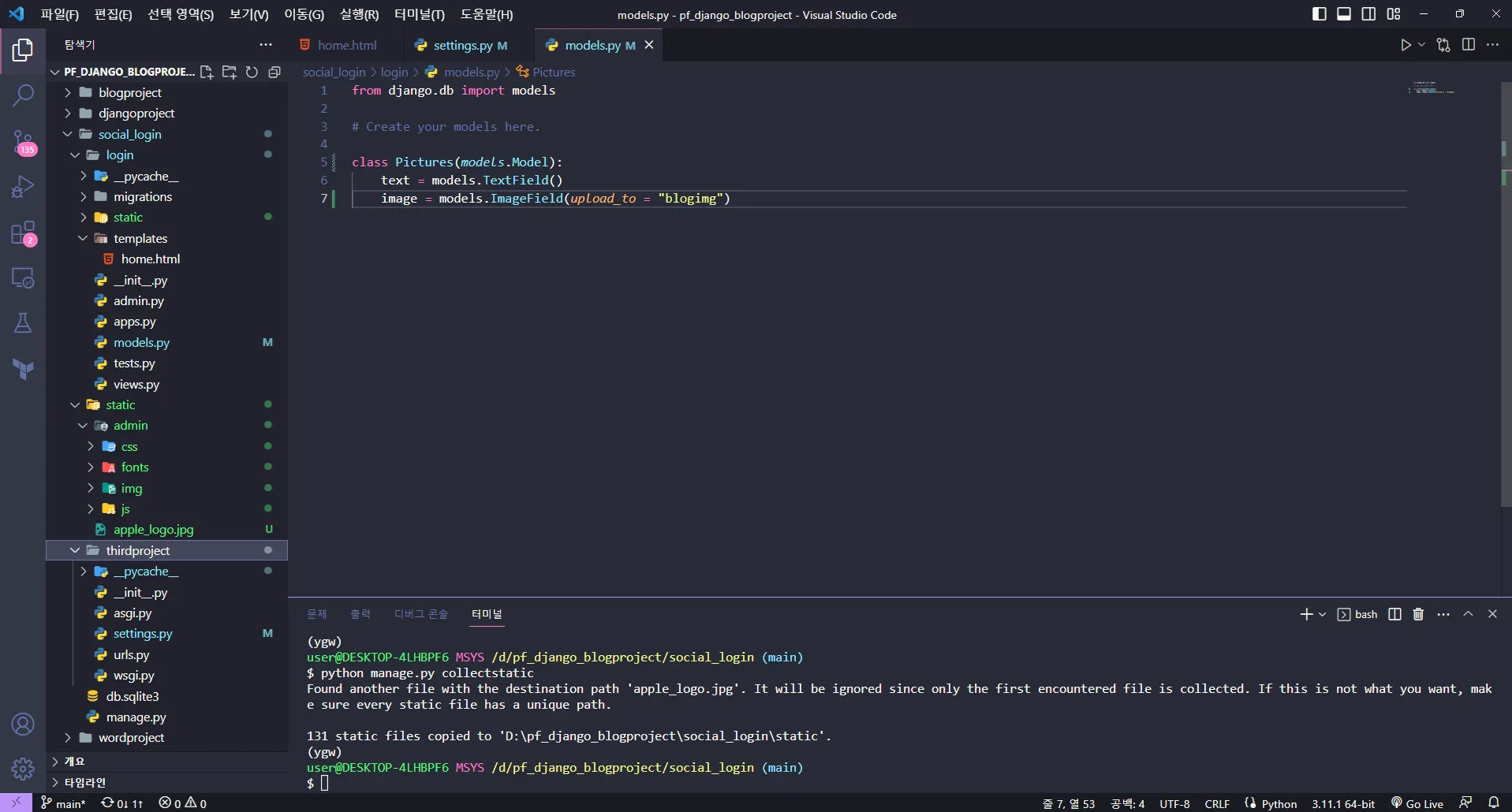 urls.py도 수정. static 클래스를 import 하는것 잊지 말기.
