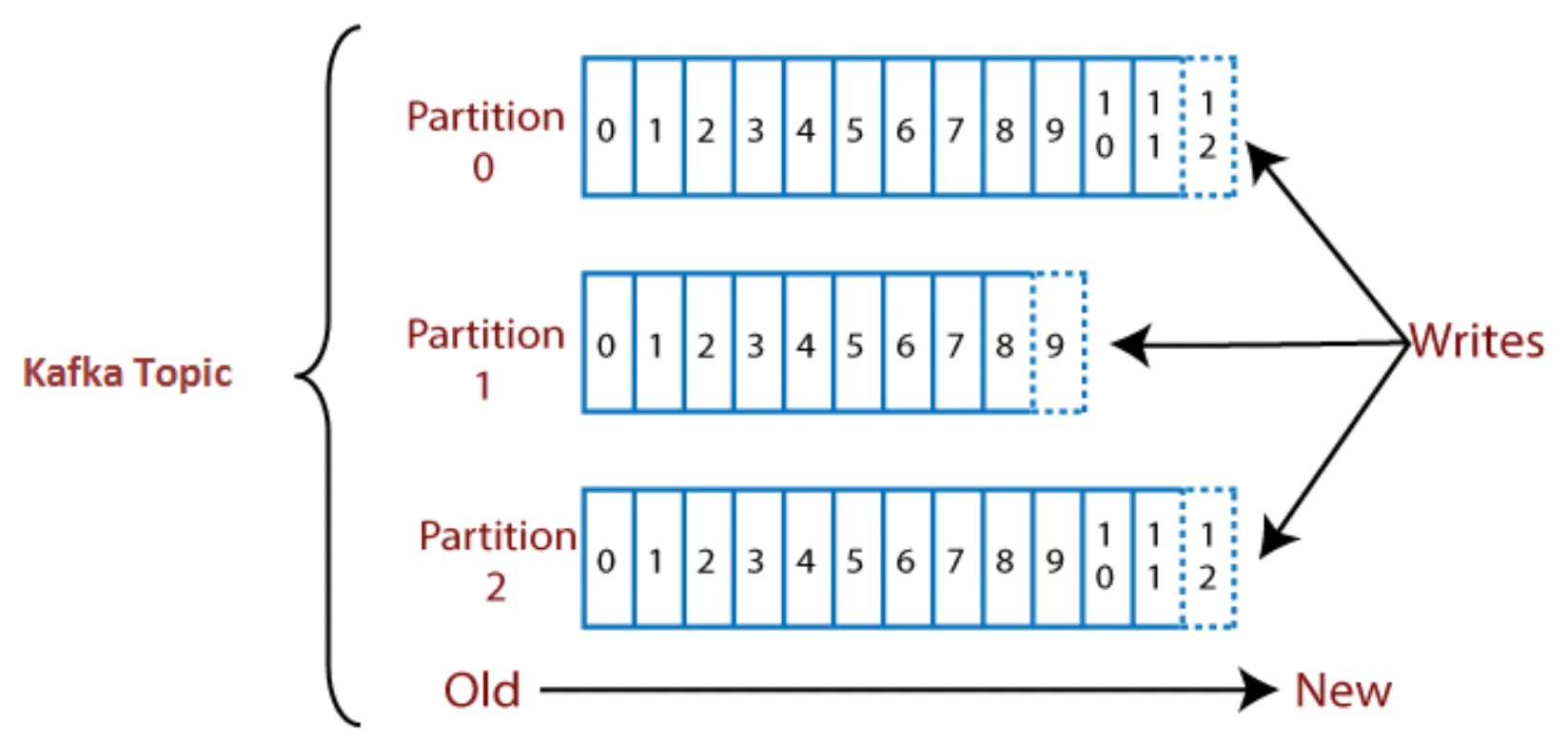 파티션(partition) : Kafka의 토픽은 여러 파티션으로 나눠진다. 토픽이 Kafka의 논리적 개념이라면, 파티션은 토픽에 속한 이벤트가 저장되는 가장 작은 물리적 저장 단위다. 파티션에 저장되는 이벤트를 레코드라고 부르며, 토픽을 생성할 때 파티션 수를 지정할 수 있다.