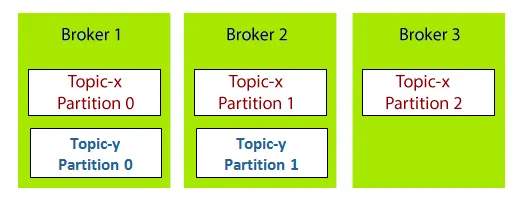 예를 들어 Broker 1, Broker 2, Broker 3 세 개의 브로커로 구성된 Kafka 클러스터를 가정해보자. 각 브로커는 Topic-x라는 토픽을 갖고 있다. Topic-x의 모든 파티션은 하나의 브로커에만 속하지 않고, 여러 브로커에 분산된다. 브로커 1과 브로커 2에는 Topic-y가 포함되어 있는데, Topic-y는 파티션 수가 2개이기 때문에 두 개의 브로커에만 분산된 것이다. 즉 브로커 번호와 파티션 번호 사이에는 어떠한 관계도 존재하지 않는다는 것을 알 수 있다.