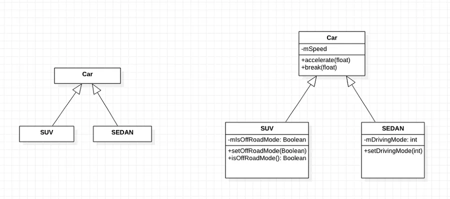 → 상속을 보여주는 UML Class Diagram이다. 자동차의 하위 계층으로 SUV와 SEDAN이 존재한다.