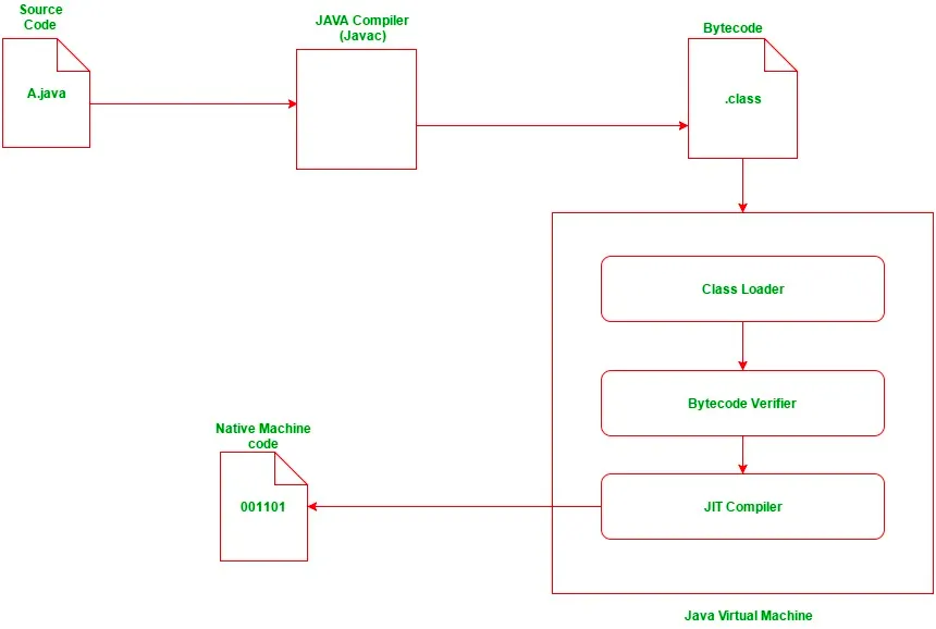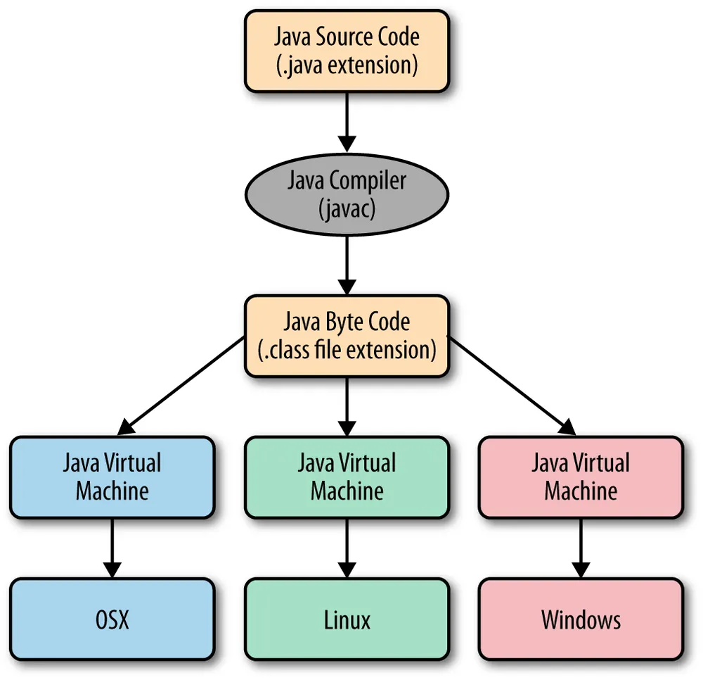 우리가 코드로 짠 자바 파일(.java 확장자)은 컴퓨터가 이해할 수 없는 언어이다. 자바파일은 자바 컴파일러(javac)에 의해서 자바 바이트 코드(.class 확장자)로 변환되며 이 자바 바이트 코드는 JVM(Java Virtual Machine)이 이해할 수 있는 언어이다.