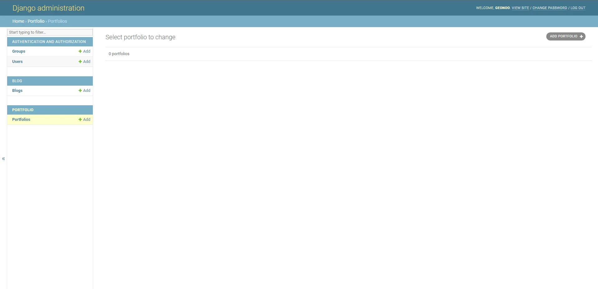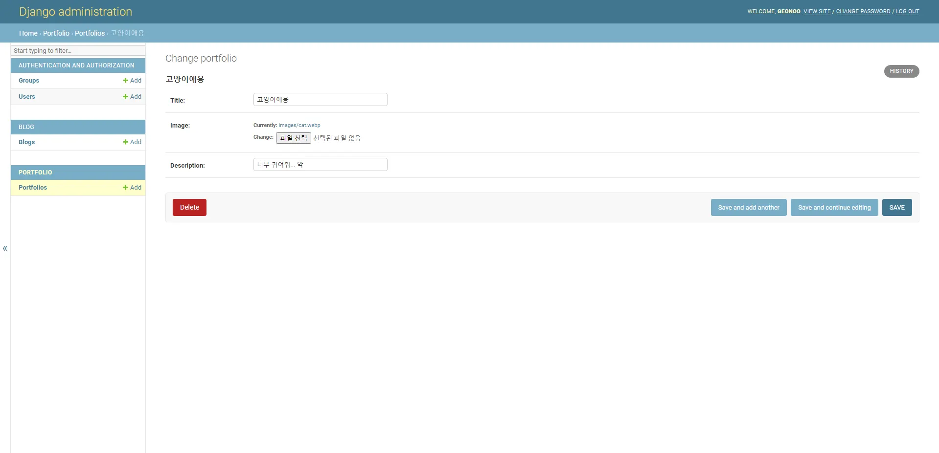 admin.py에 ‘portfolio DB사용할거야’ 하고 알려준다. 이제 admin페이지에 portfolio가 나타난다.