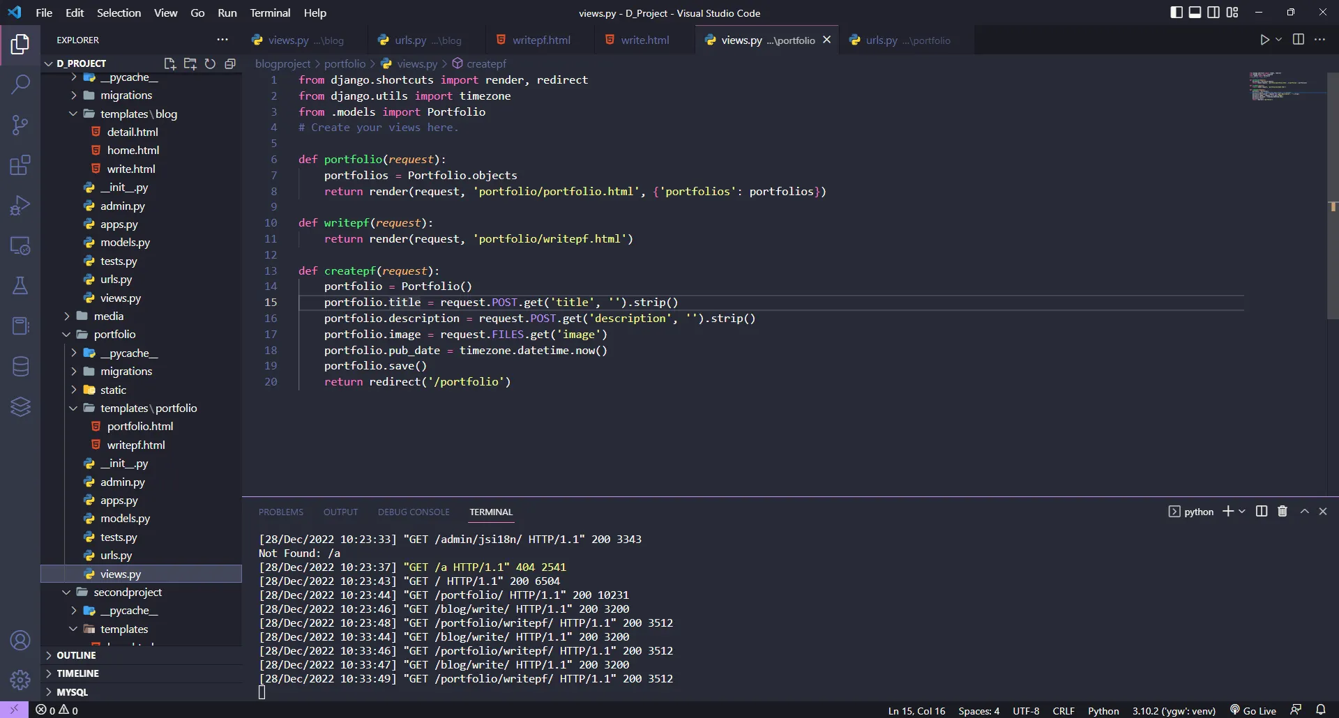 blog app에서 작성했던걸 복붙해 온다. blog 폴더 안에 admin.py안에 있는 내용을 복사해, portfolio 안 admin.py안에 붙여넣고, blog라고 쓰여진 내용을 전부 portfolio로 바꿔보자.
