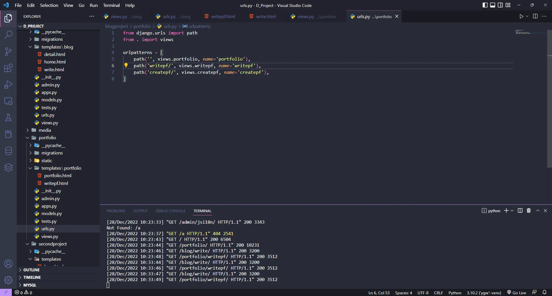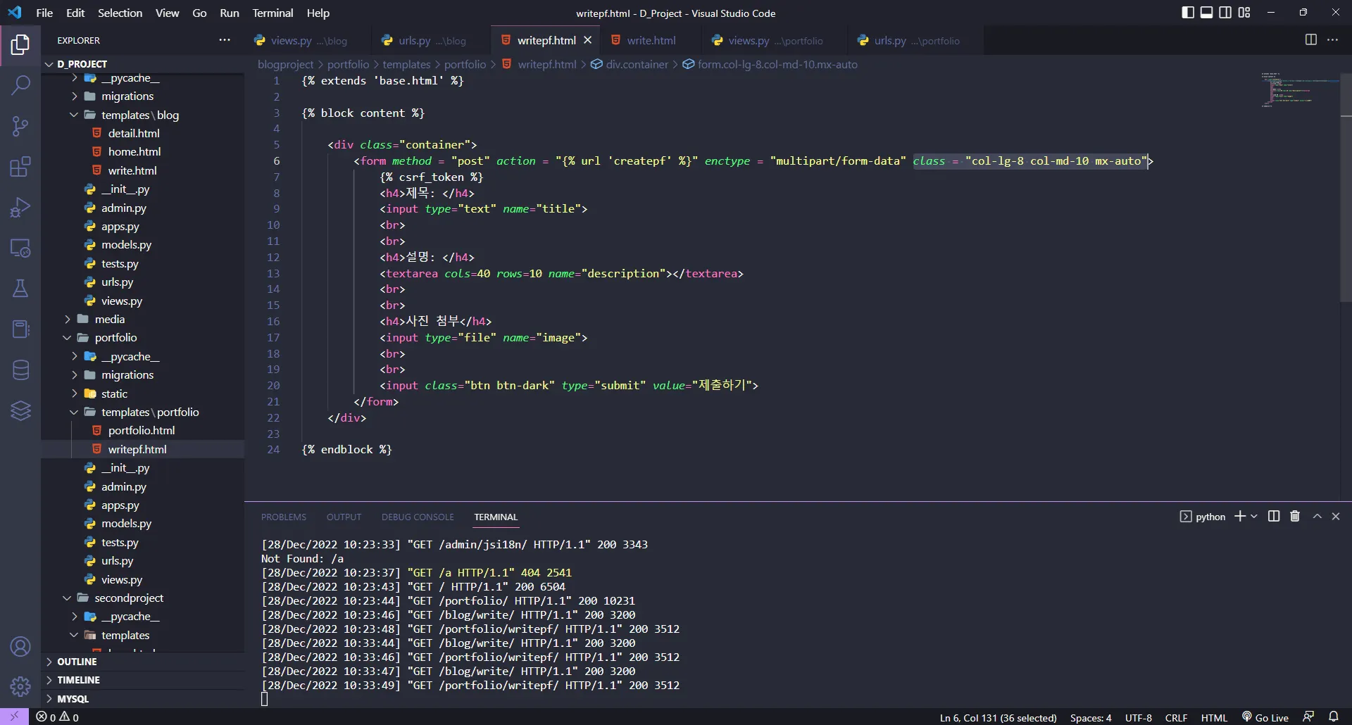 그렇게 만들어진 writepf.html POST 메소드를 쓸때는 csrf_token을 사용해야한다. 오류방지용.