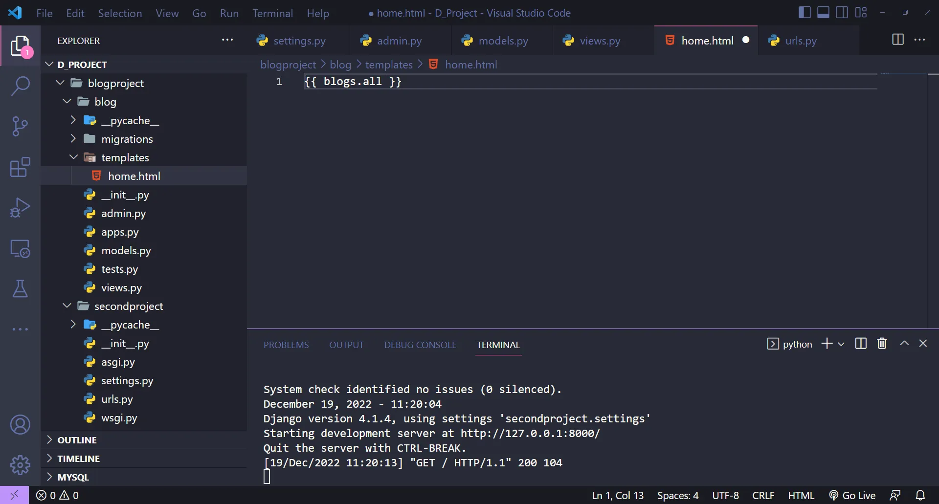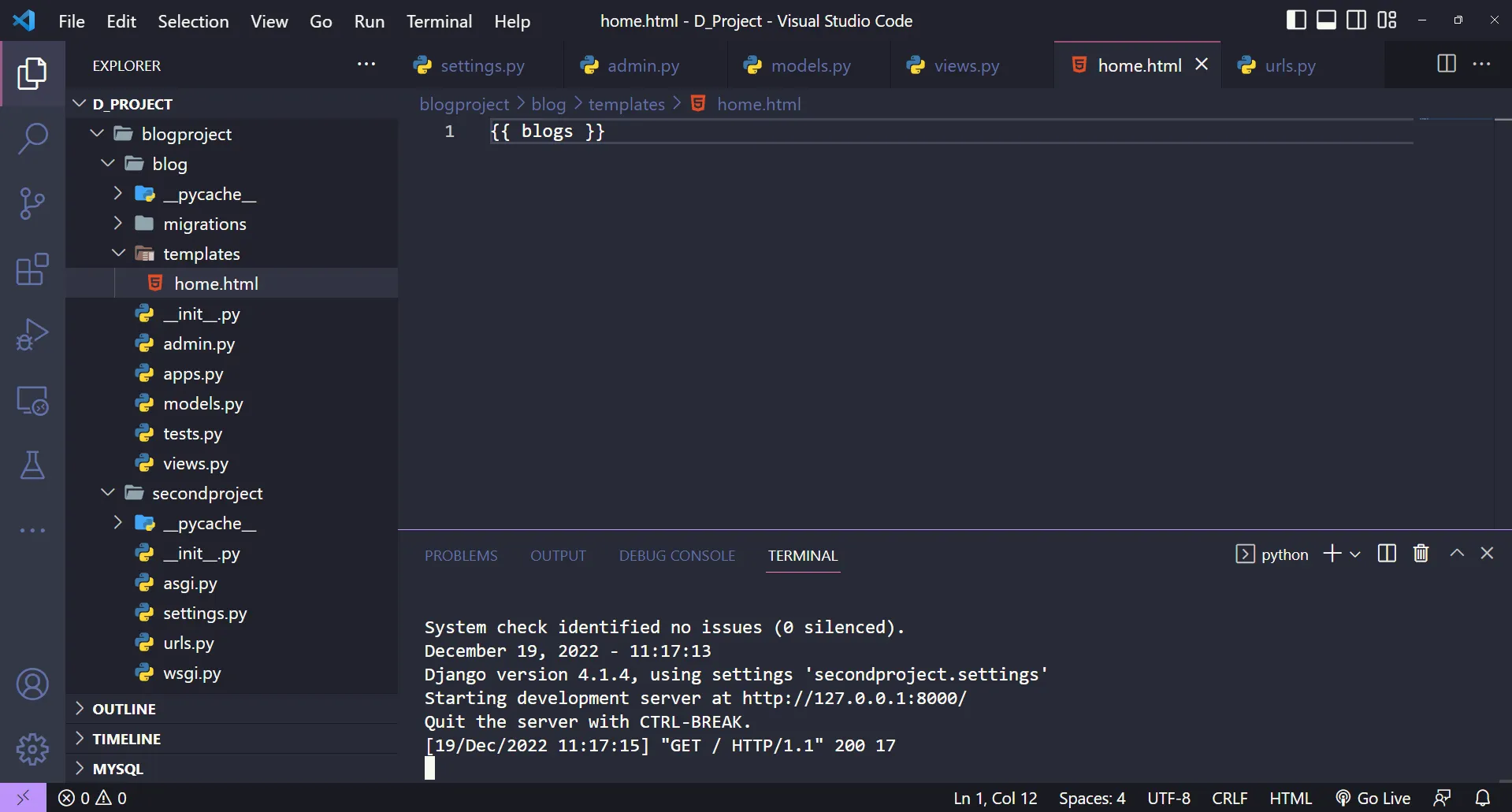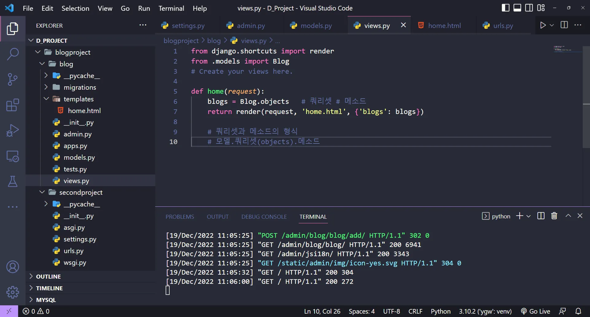 ๋จผ์ Blog๋ฅผ import ํด์ฃผ๊ณ , Blog.objects๋ฅผ blogs ๋ผ๋ ๋ณ์์๋ค๊ฐ ๋ฃ์ด์ค๋ค.