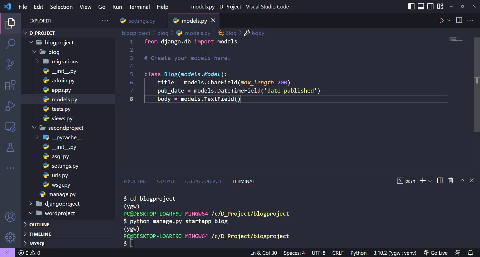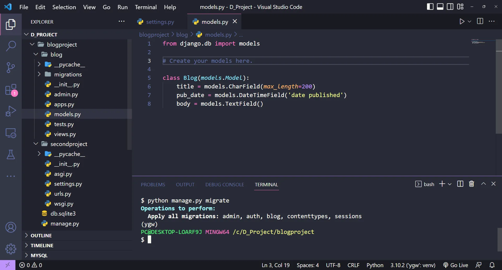 ์์ ๊ฐ์ด model์ ์์ฑํ์ผ๋ฉด ์ด์ python manage.py๋ก ์ถ๊ฐ์ ์ธ ๋ช