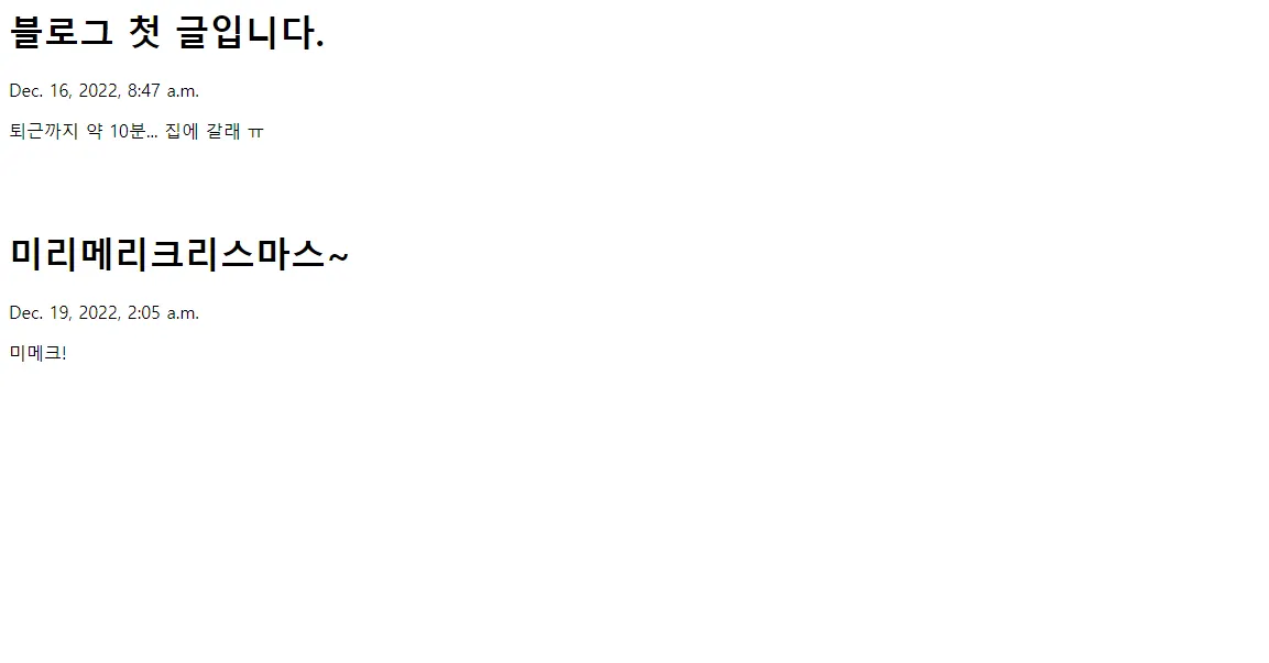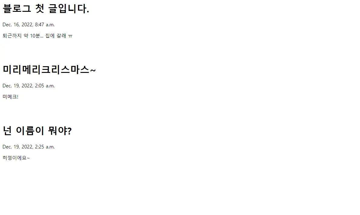 ์ด๋ฐ ํ์ด์ง๊ฐ ๋์จ๋ค. ๋ด๊ฐ ์จ๋์ ๊ธ์ ์ ๋ชฉ ๋ชฉ๋ก๋ค์ด ๋ชจ๋ ์ถ๋ ฅ๋์๋ค.