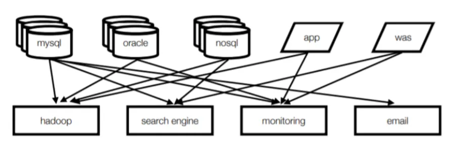 각 애플리케이션과 데이터 시스템 간의 별도의 파이프라인이 존재하고, 파이프라인마다 데이터 포맷과 처리 방식이 전부 다름