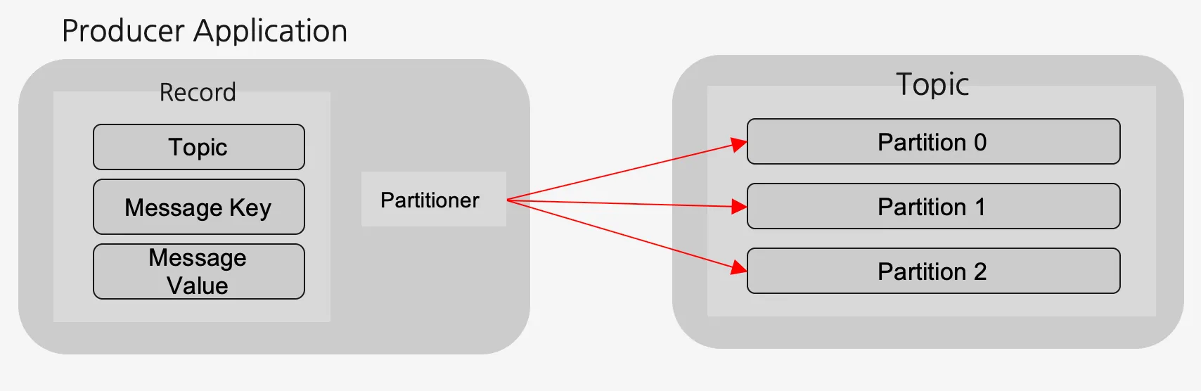파티셔너: 데이터를 토픽의 어떤 파티션 내에 넣을지 결정하는 역할 수행
