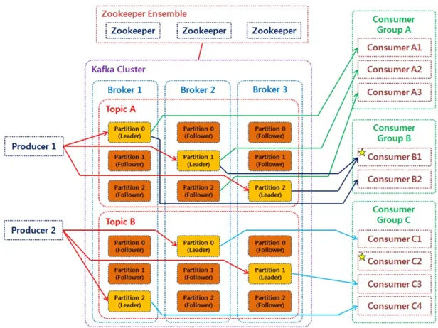 → 어떤 consumer에서 오류가 발생한다면, 파티션 재조정(리밸런싱)을 통해 다른 컨슈머가 해당 파티션의 sub을 맡아서 한다. 오프셋 정보를 그룹간에 공유하고 있기 때문에 오류가 발생하기 전 마지막으로 읽었던 데이터 위치부터 시작한다
