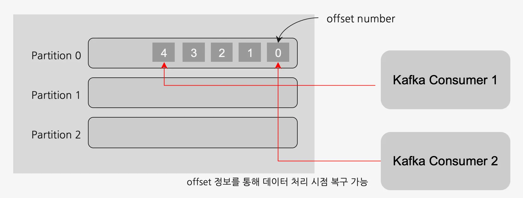 컨슈머가 갑자기 동작이 중지되어도 이 오프셋 정보를 통해 데이터 처리 시점을 복구할 수 있음