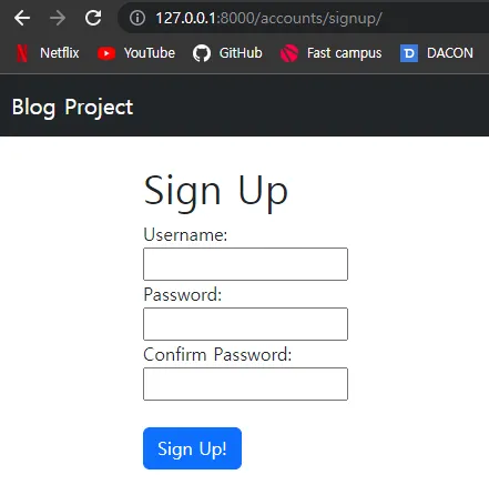 그래서 templates/accounts 안에 signup.html과 signin.html 두개의 페이지를 만들어 줬다. 기본 base.html을 상속해올꺼니까 extends 블럭도 추가한다.