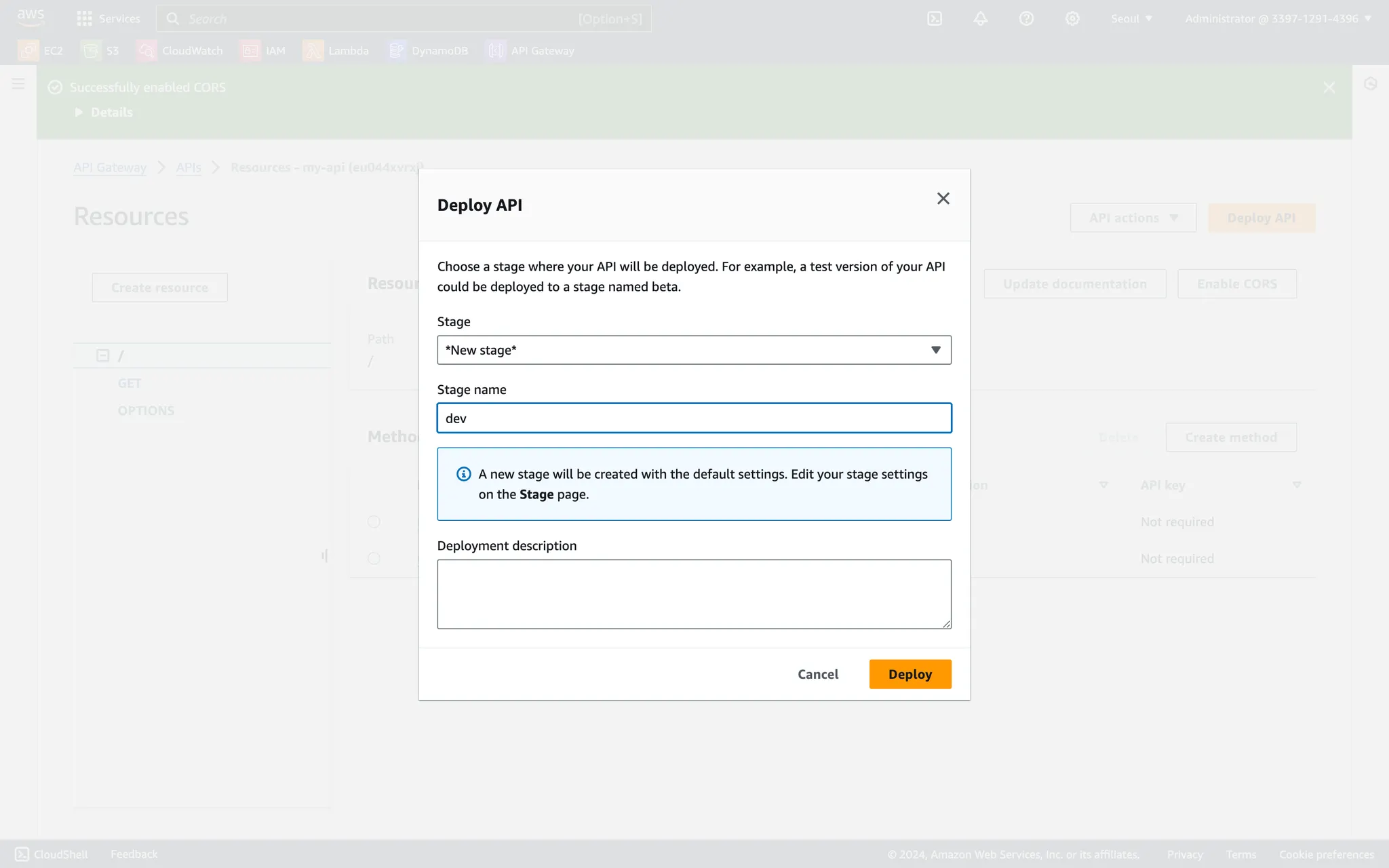 api 가 정상적으로 작동된다는 것을 확인하고, 추가 설정을 마쳤으니 이제 이 api 를 실제 사용할 수 있게 준비하자. Resources 화면에서 Deploy API 를 누른다.