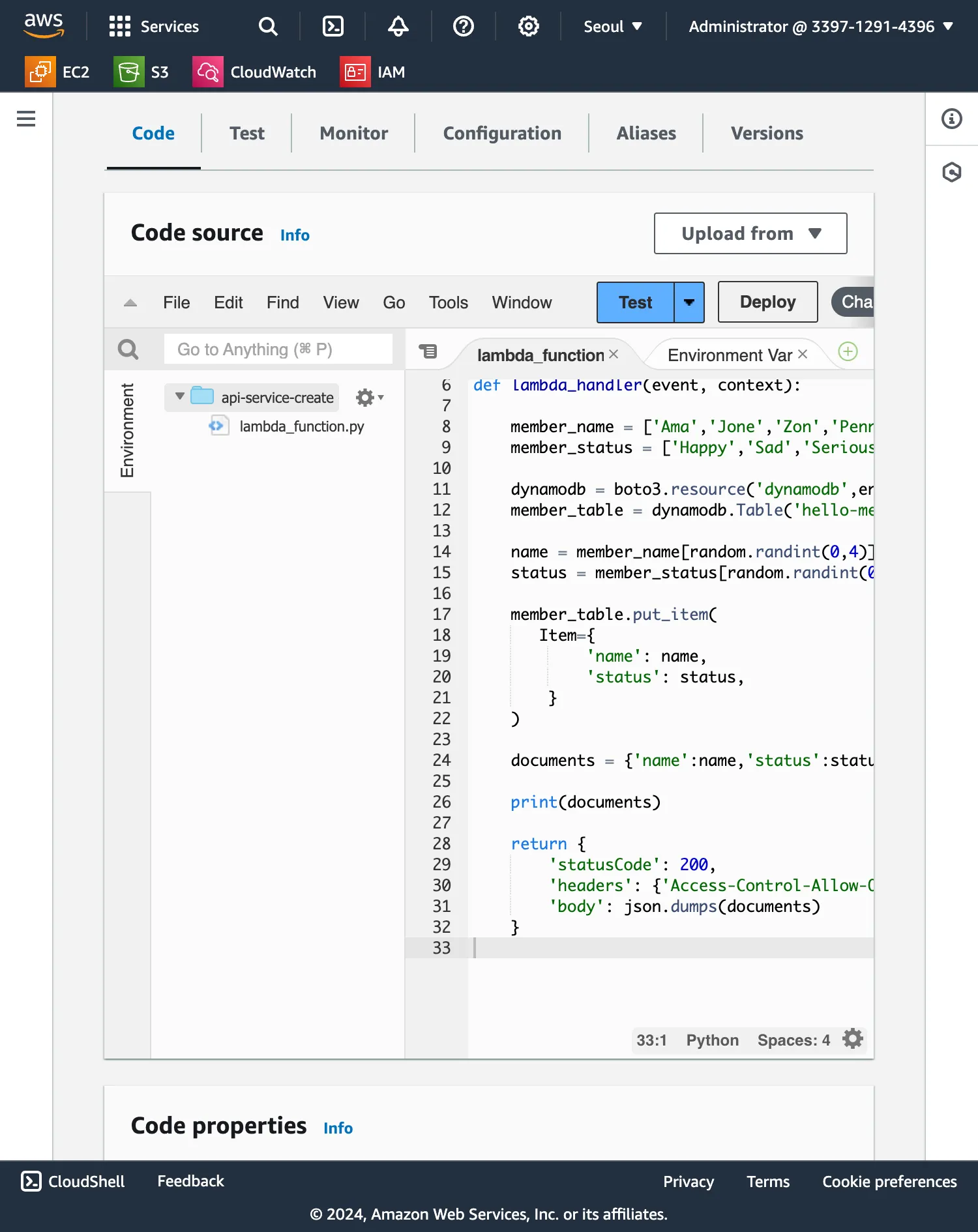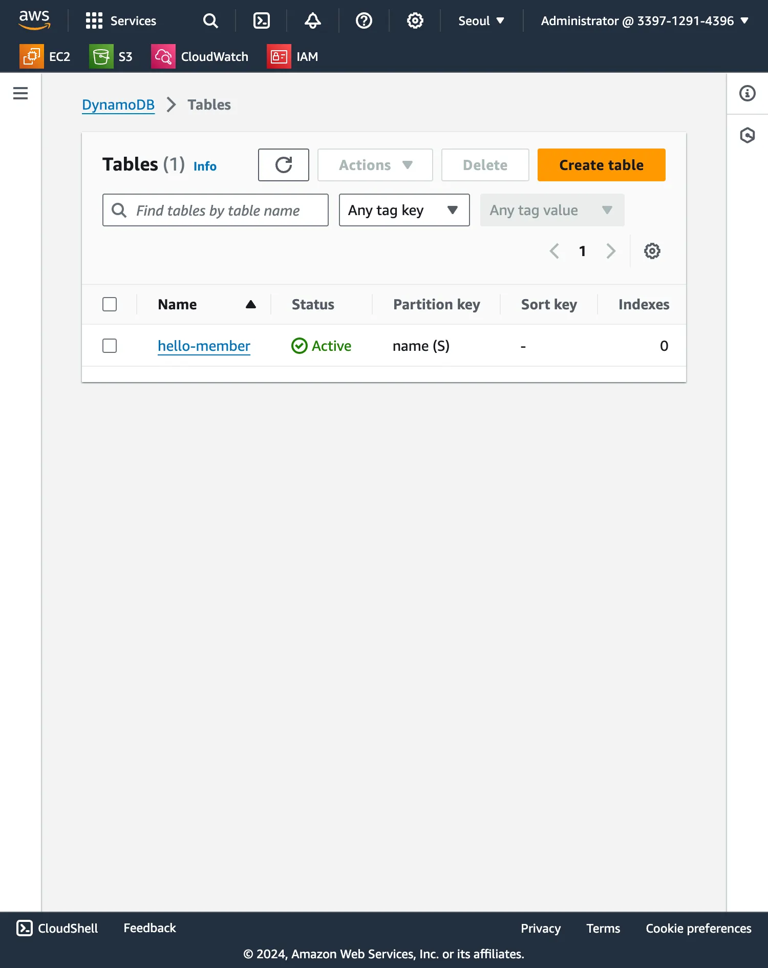 이렇게 name 이라는 기본키를 가진 hello-member 테이블을 생성하였다. 이제 앱서버 기능을 하는 Lambda를 생성하고 코드를 작성해 보자.