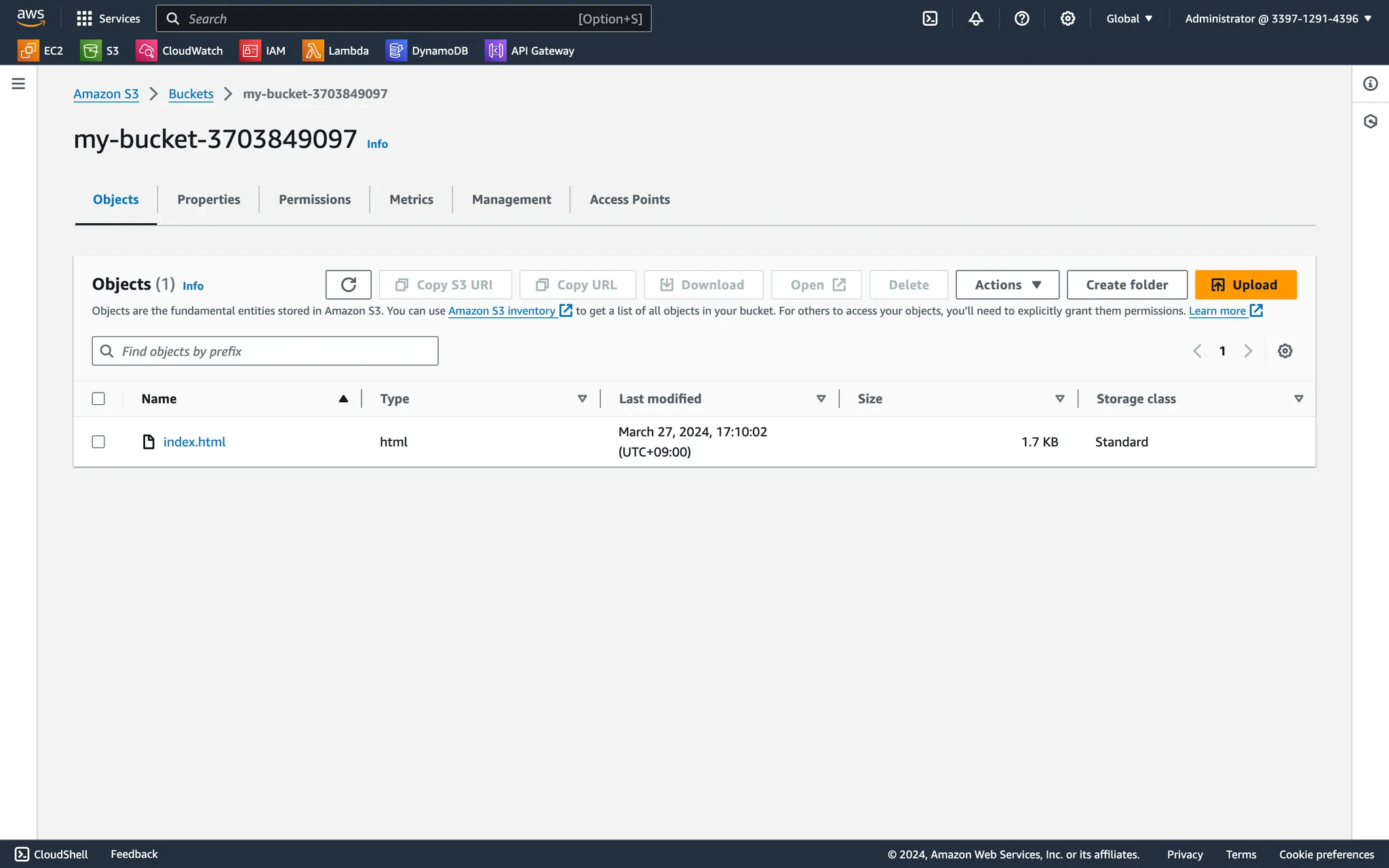 마지막으로 S3의 정적 웹사이트 호스팅 기능을 사용하여 Web 서버를 대체한다. S3 bucket에 index.html 파일을 배포하고 권한을 부여하여, 전세계 사용자들이 내가 만든 웹애플리케이션에 접근하여 사용할수 있도록 해보자.