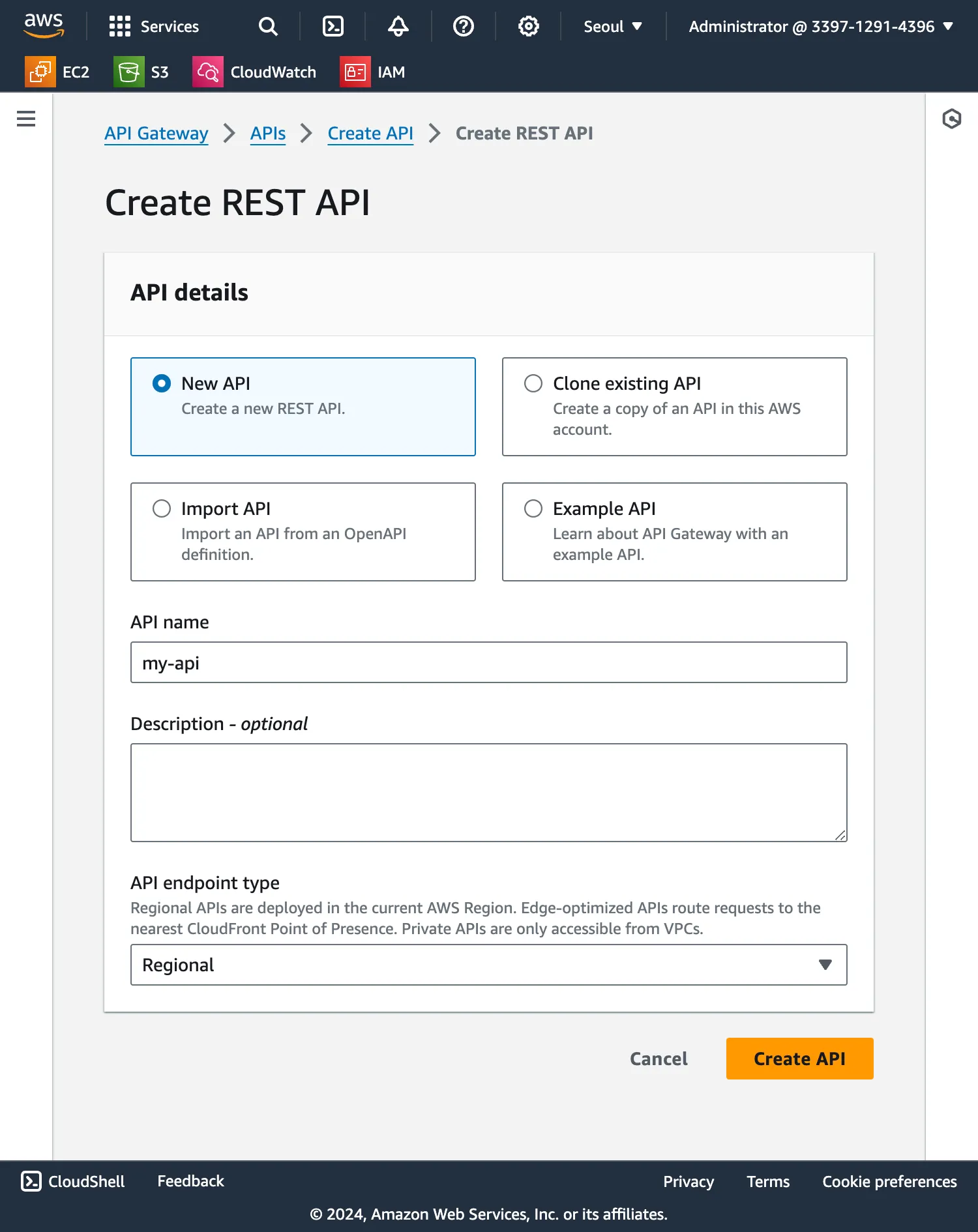 API Gateway는 AWS의 API 관리 서비스이다. API 란 외부에서 기업의 서비스를 이용하려고 할때 규격을 정해주는 것을 의미한다. 일종의 형식을 정해놓고, 이 형식대로 기업의 서비스를 호출하면 기업은 서비스를 제공해 주는 약속이라고 생각하시면 된다. API Gateway는 이런 API 를 관리해주고 API 를 통해 외부에서의 호출이 왔을때 대문 역할을 하는 AWS 서비스이다.