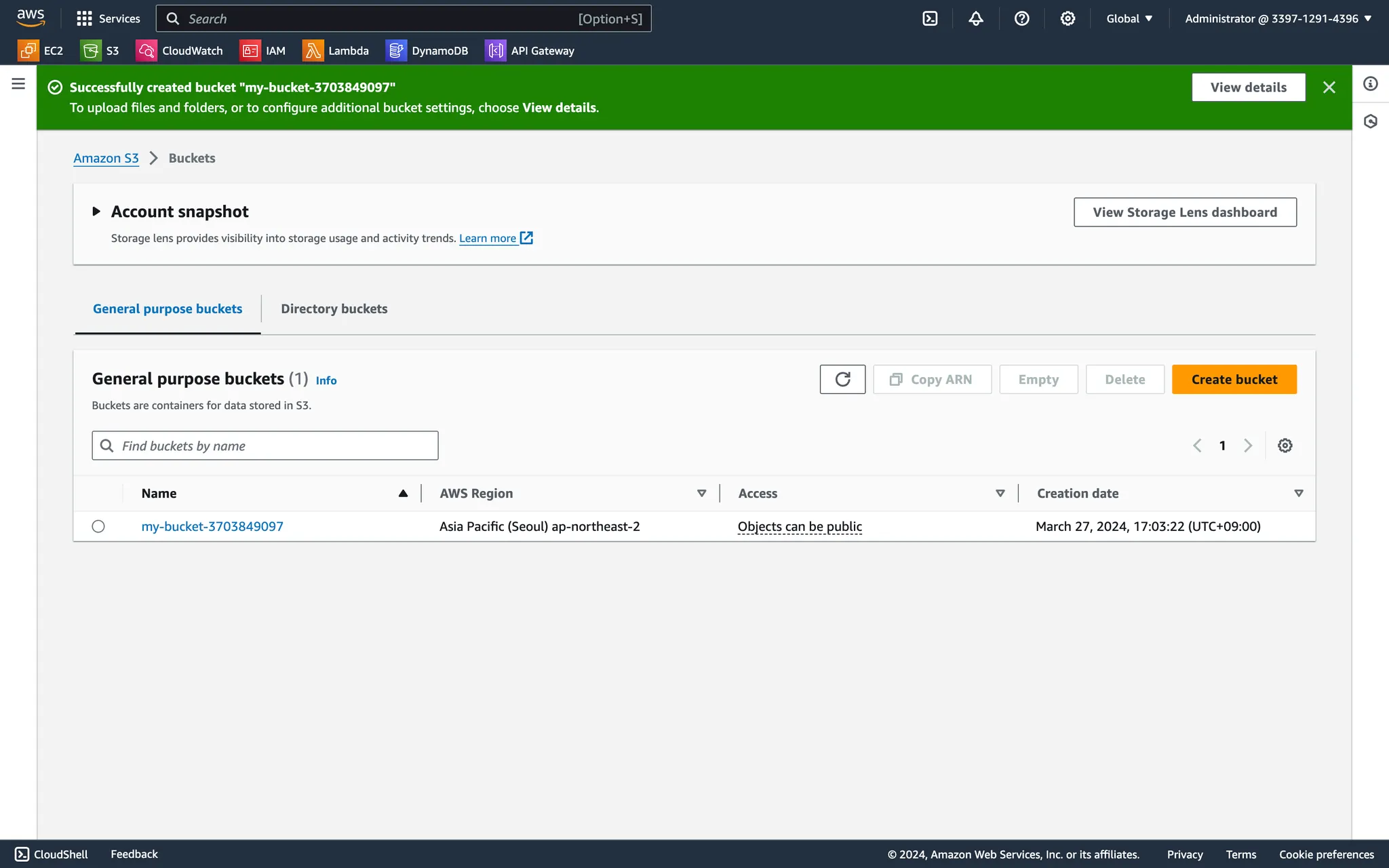 여기서 [random number]는 무작위 숫자이며, 대괄호를 빼야한다. (Bucket name은 전세계에서 유일해야 함.)