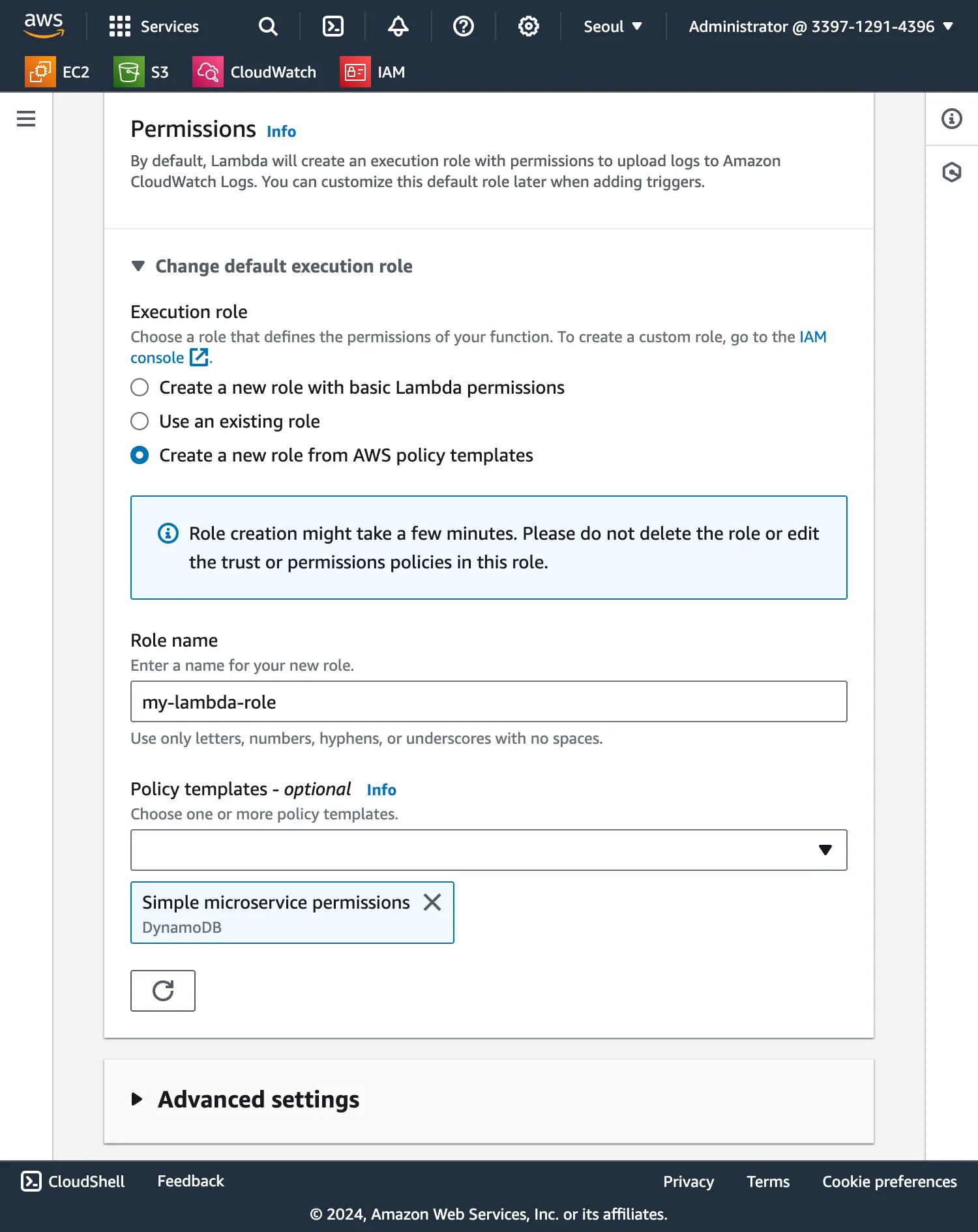 Create a new role from AWS policy templates를 누르고, my-lambda-role이름으로 Simple microservice permissions를 지정하여 생성한다.