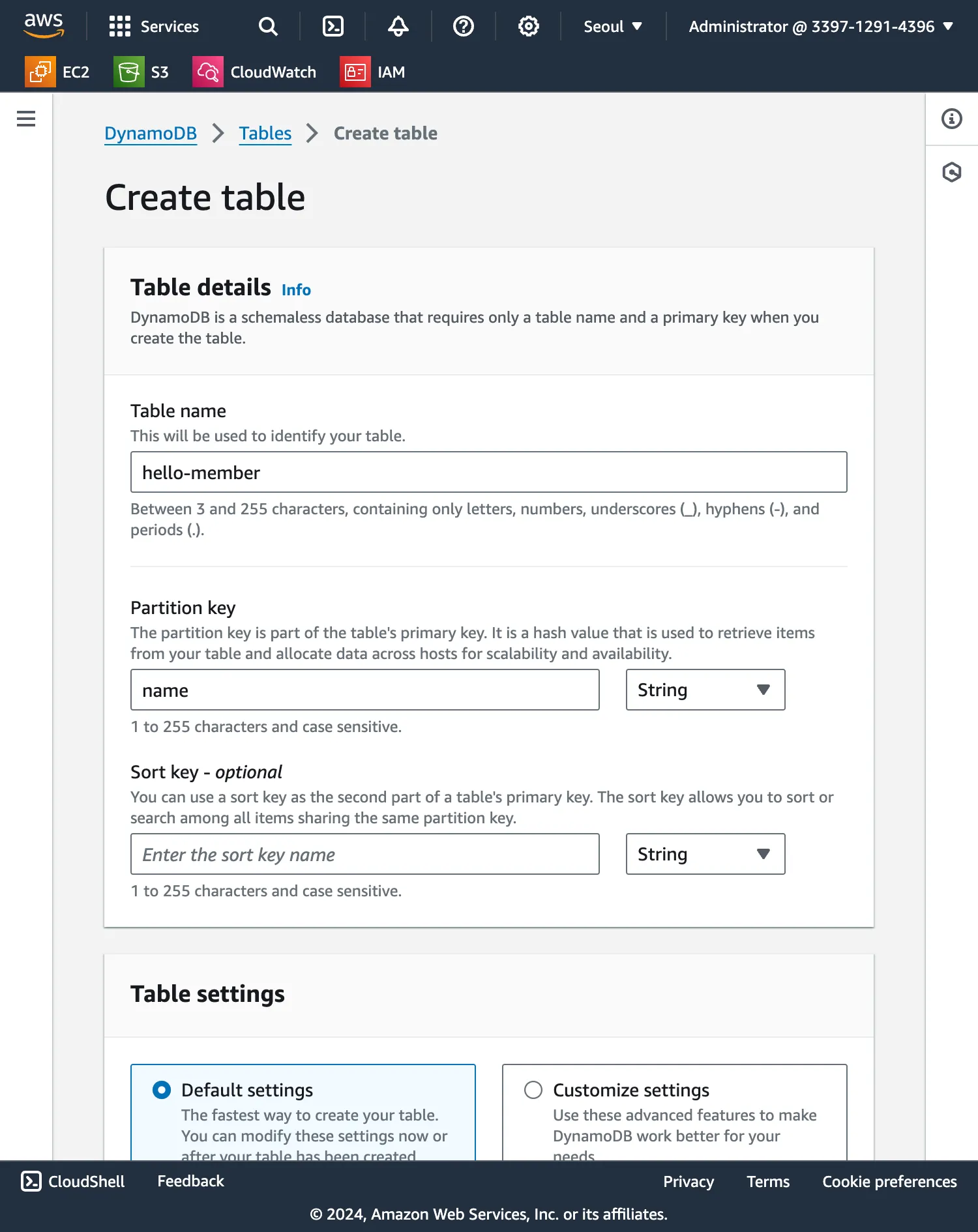 hello-member 테이블을 생성하고, Partition key에는 name을 설정한다.