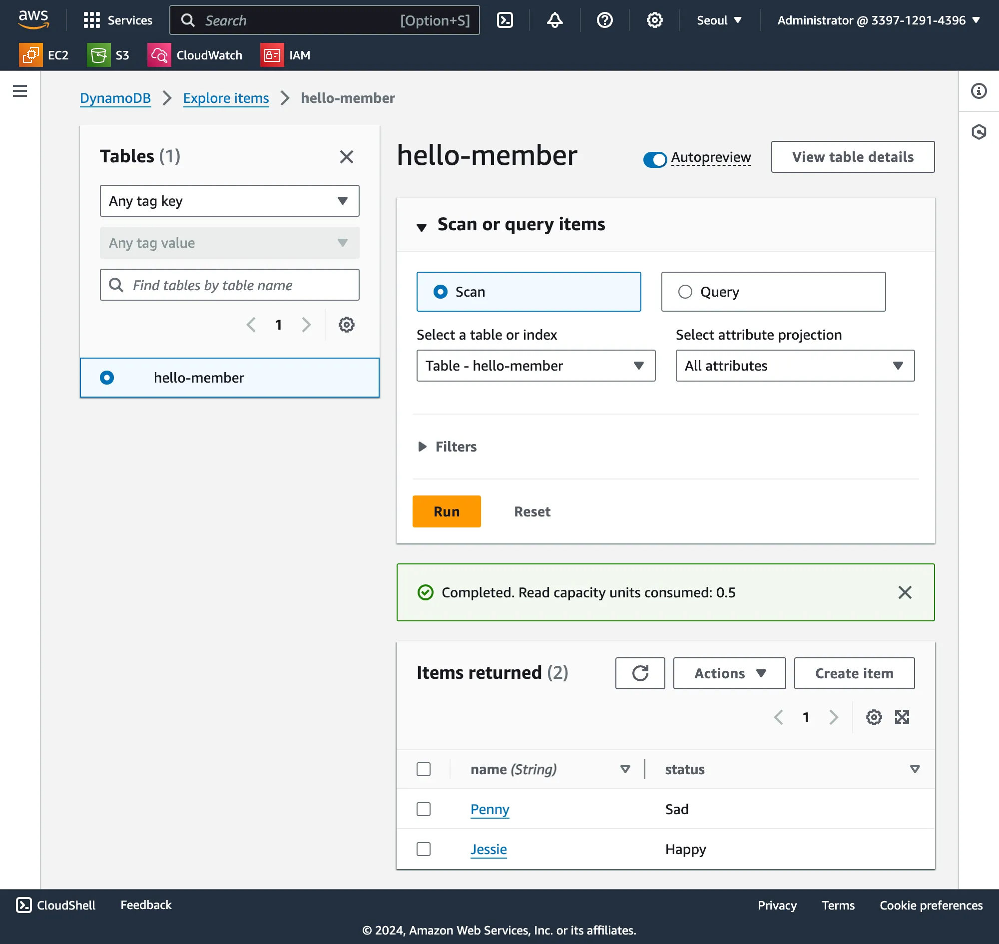 DynamoDB에서 확인해보면, Items returned에 Lambda로 입력한 값이 잘 저장된 것을 확인할 수 있다.