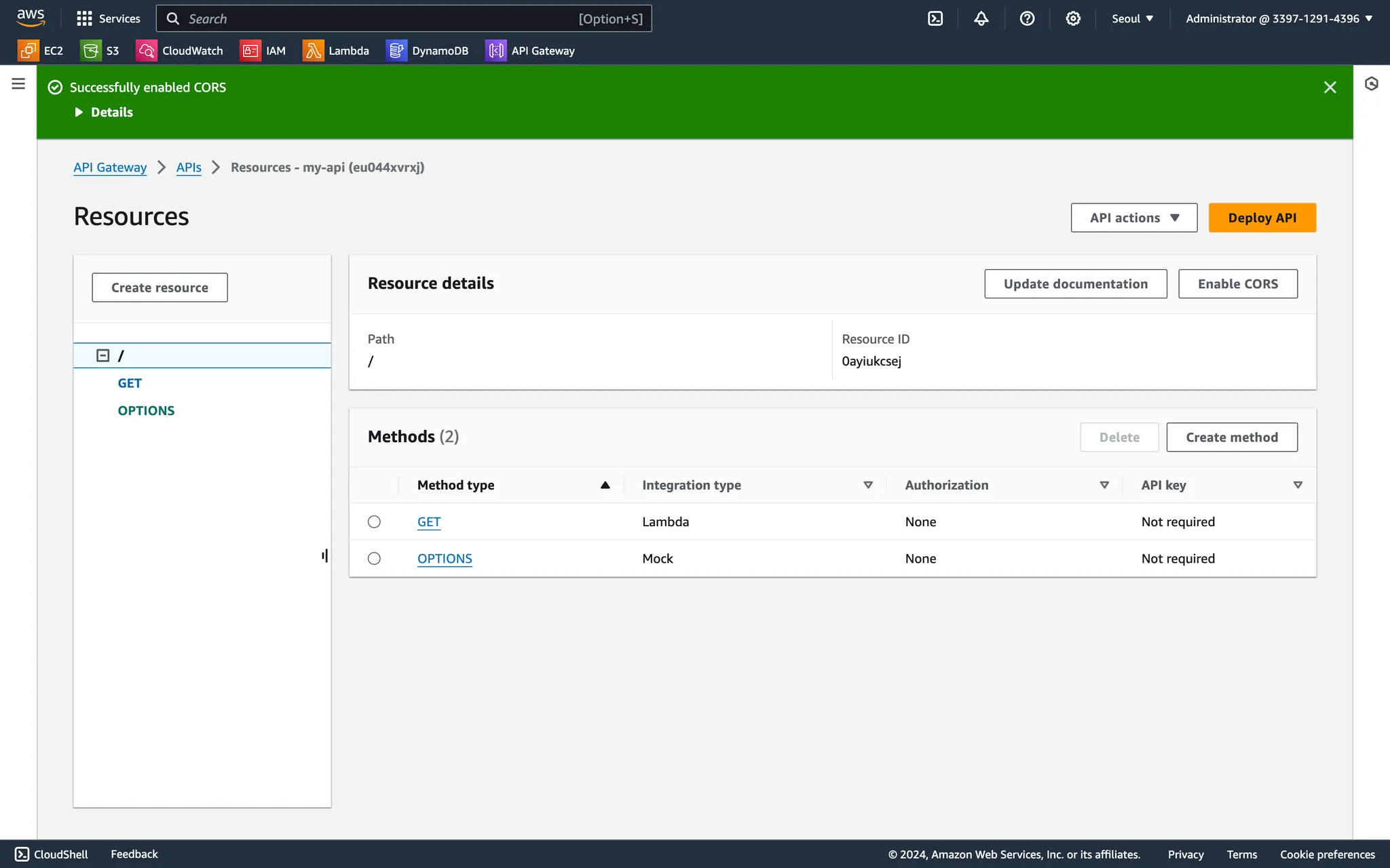 생성한 API의 Resources 메뉴에서 Enable CORS 를 클릭하고, 생성한 GET Method를 선택 후 Save.