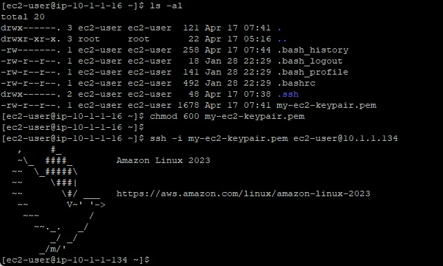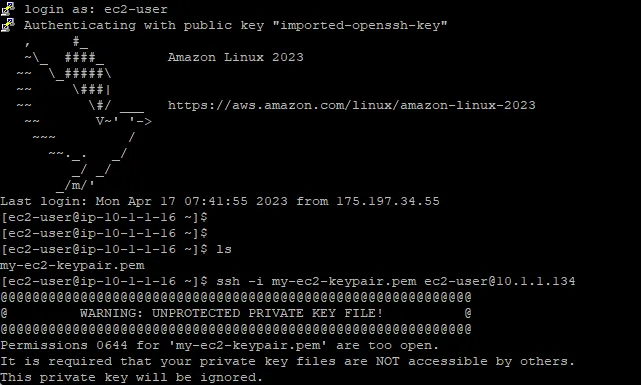 chmod 600 my-ec2-keypair.pem 입력 후 다시 위의 명령어를 입력하면 private IP 서버로 넘어온 것을 확인할 수 있다. (10.1.1.134)