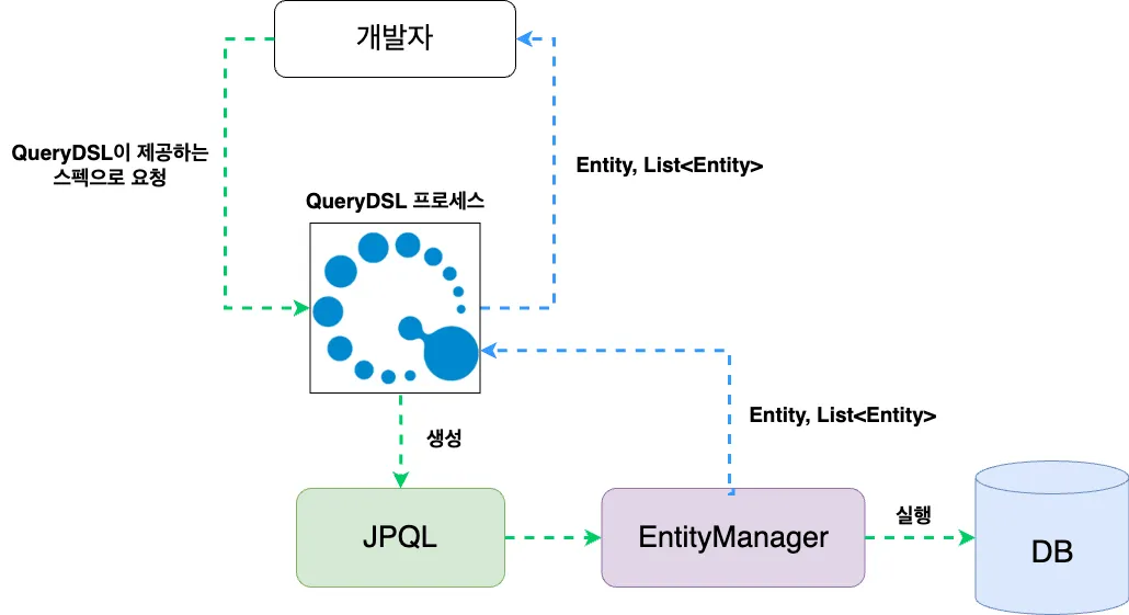 개발자가 작성한 쿼리는 QueryDSL 프로세스에 의해 처리된다. QueryDSL 프로세스는 자바 코드 기반의 쿼리 요청을 분석하고, 이를 적절한 SQL이나 JPQL로 변환하는 역할을 한다. 이 과정에서 컴파일 타임에 쿼리의 오류를 검출하고, 동적 쿼리의 조건을 처리하게 된다.