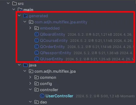 컴파일이 완료되면 QUserEntity등의 엔티티 클래스와 매핑되는 Q-Class가 생성된다.