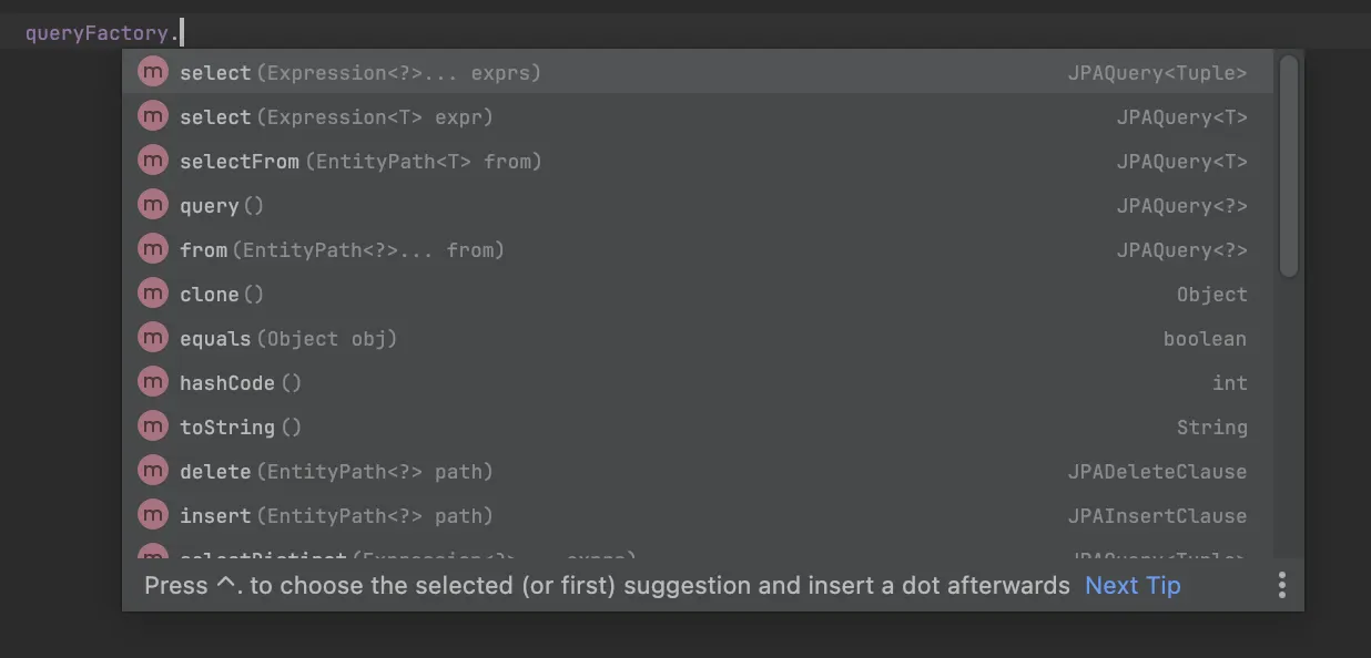 이렇게 생성된 Q-Class를 사용하면 쿼리 작성 시 컴파일 타임에 오류를 잡을 수 있으며 IDE의 코드 자동완성 기능을 활용할 수 있어 편리하다.