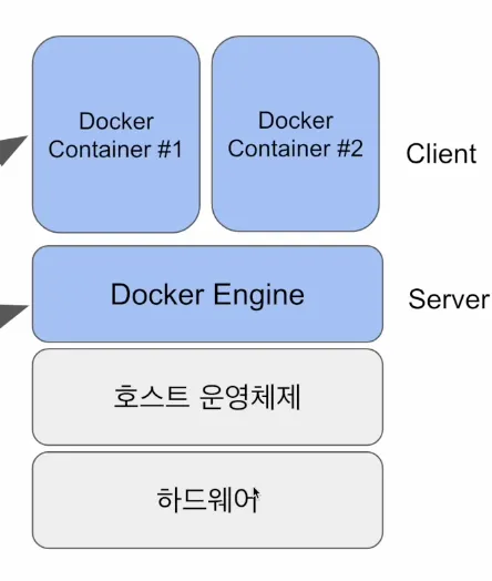 docker에서는 Host OS(Linux)와 다른 부분만 컨테이너에 있고, 커널은 Host OS와 공유하는 방식이다.