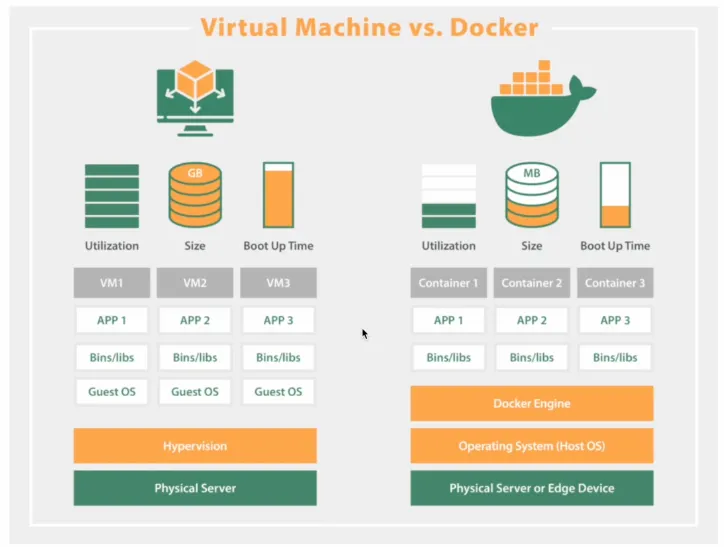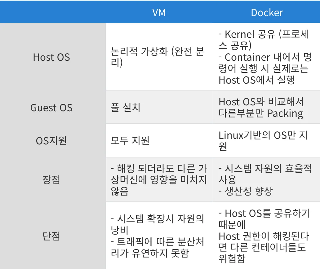 Guest OS가 VM에서는 풀(full OS)로 설치해야 사용 가능하고, docker에서는 격리 개념으로 분리된다는 것.