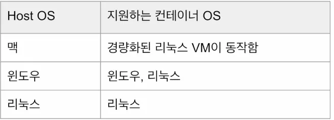VM은 사용자가 윈도우를 사용하고 있더라도 새로운 GuestOS를 설치할 때 리눅스 OS를 설치해서 사용할 수 있지만, 컨테이너는 리눅스 OS에서 윈도우용 컨테이너를 사용할 수 없다.