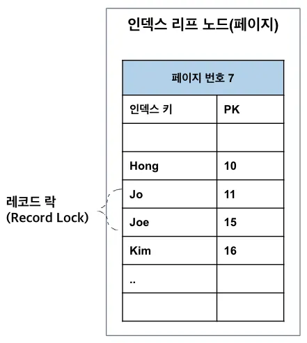 일반적으로 레코드 락은 테이블 레코드 자체를 잠그는 락을 의미한다. 레코드 수준의 잠금은 상당히 작은 공간으로 관리되기 때문에 레코드 락이 페이지 락으로, 또는 테이블 락으로 레벨업되는 경우(락 에스컬레이션)는 없다.