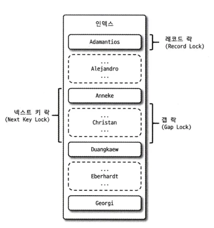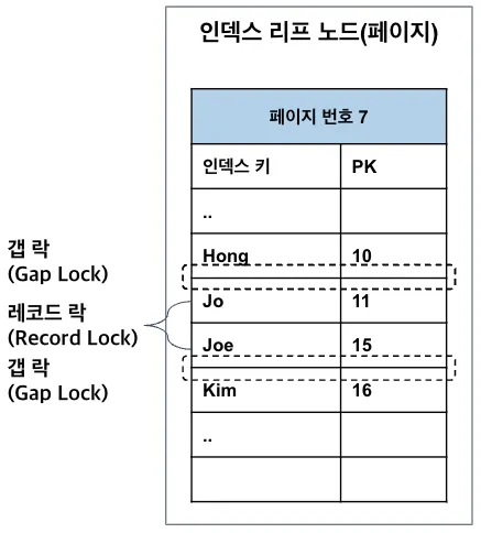 레코드 락이 테이블이 아닌 인덱스에 걸린다는 점을 포함하여, 다른 DBMS와 차이나는 부분이 바로 갭 락이다. 갭 락(Gap Lock)은 레코드가 아닌 레코드와 레코드 사이의 간격을 잠금으로써 레코드의 생성, 수정 및 삭제를 제어한다. 예를 들어 현재 성이 J로 시작하는 레코드가 Jo, Joe 2개가 있다고 하자. 그리고 언제든지 다른 데이터들 ex) Jang, Jeong, Jung 이 추가될 수 있다.
